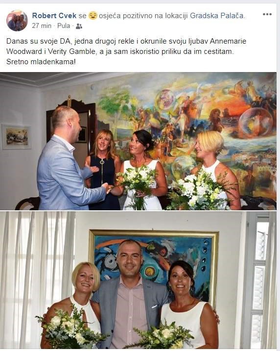 "Danas su svoje DA, jedna drugoj rekle i okrunile svoju ljubav Annemarie Woodward i Verity Gamble, a ja sam iskoristio priliku da im čestitam. Sretno mladenkama!", napisao je dogradonačelnik Cvek, davši time do znanja da je grad Pula i u ovom segmentu ukorak s europskim standardima te promovira toleranciju i jednakost.