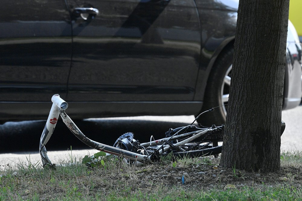 Tada je prednjim dijelom motocikla naletio je na desnu stranu bicikla marke Fuji kojim je upravljao zasad nepoznati vozač, a kretao se biciklističkom stazom prelazeći sjeverni kolnik Zagrebačke avenije preko pješačkog prijelaza s istočne strane raskrižja u smjeru sjevera za vrijeme dok je na semaforskom uređaju za njegov smjer kretanja bilo upaljeno neutvrđeno prometno svjetlo.