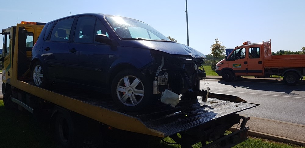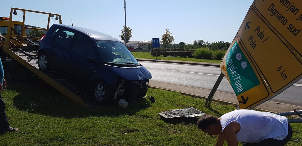 U utorak oko 9 sati na križanju kod benzinske "Petrol" u Vodnjanu dogodila se prometna nesreća u kojoj su sudjelovala dva automobila, Renault Scenic i Škoda Felicia. Vozač Škode je išao iz smjera Vodnjana, a vozač Renaulta se iz smjera Galižane uključivao na glavnu cestu kojom se kretala Škoda te se u tom trenu dogodila nesreća. Očevidci kažu da je vozač Renaulta malo više "izvirio" s automobilom, a da je vozač Škode vozio neprimjerenom brzinom. U trenu kada je došlo do sudara Renault je odbačen više od sto metara te se zabio u stup koji upozorava na kružni tok. Zasada nikome nije jasno kako je vozač Renaulta uspio prokliziti sto metara, no najvažnije je da nitko nije ozljeđen te da je sve prošlo samo s materijalnom štetom. (Napisao i snimio E.GARIBOVIĆ)