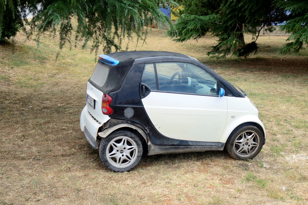 Uslijed siline udarca Smart je odbačen na travnjak uz nebodere.