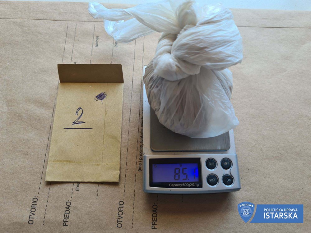Na temelju sudskog naloga obavili su pretragu kuće u Puli u kojoj stanuje te pronašli vrećicu s 85,1 grama heroina i dvije precizne digitalne vage. U pretrazi dvorišta pronađena je i skrivena vrećica s još 5,9 grama heroina.