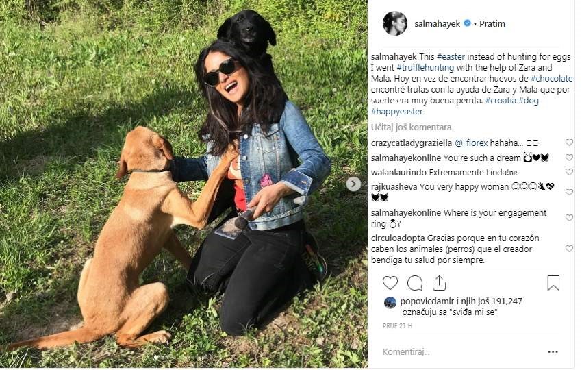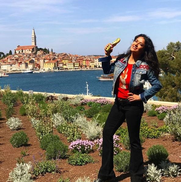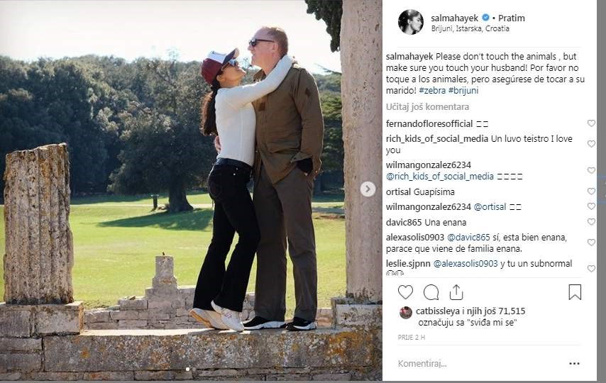 Holivudska diva Salma Hayek očito uživa u Istri - naime, gotovo svakodnevno na svom Instagram profilu objavljuje fotografije, pa je tako u svijet poslala Uskrsnu čestitku s prizorom Rovinja u pozadini, zatim je jedan dan provela u "lovu" na tartufe, pa na Brijunima sa svojom kćerkom Valentinom Pinault te suprugom, milijarderom Francoisom Henrijem Pinaultom.