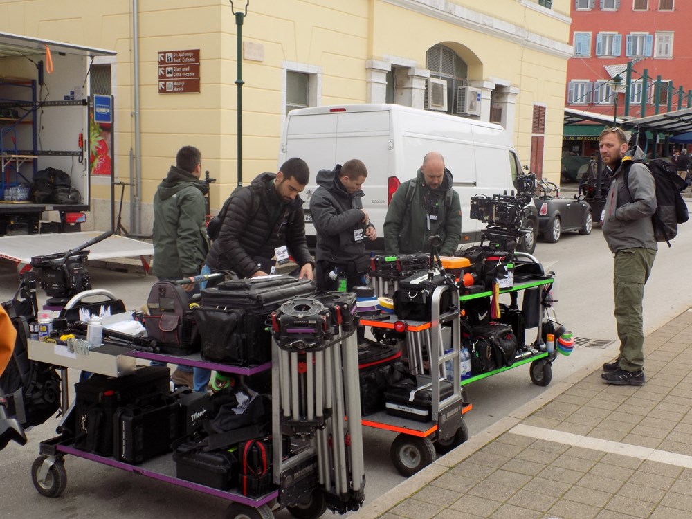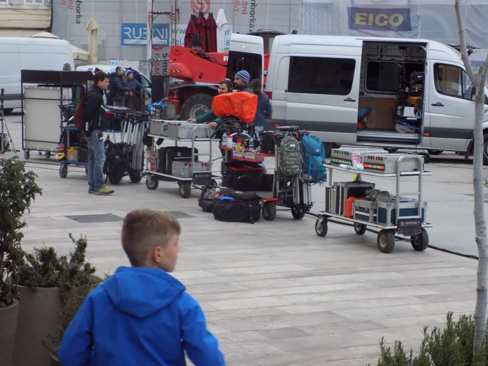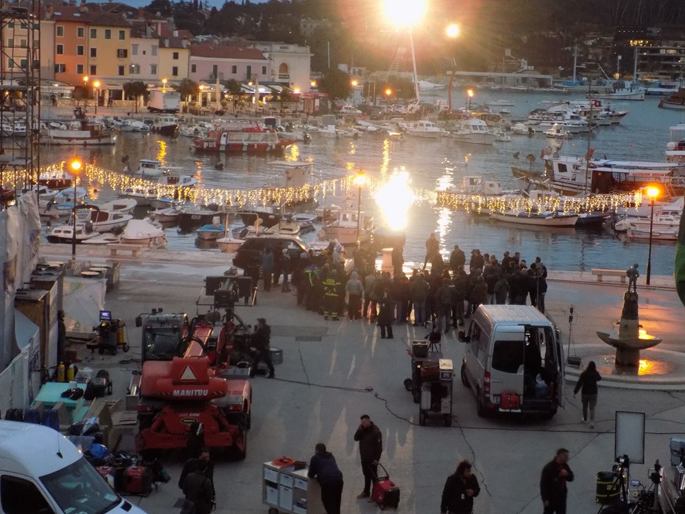 Današnje je poslijepodne donijelo filmsko komešanje na rovinjskom Trgu maršala Tita. Nakon što se pojavila dizalica, na rivu su pomalo počeli pristizati i kamioni s opremom - od strunjača, reflektora, do betonskih pontona