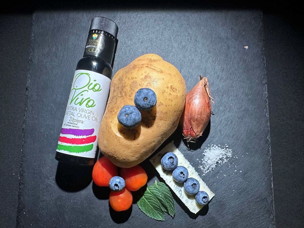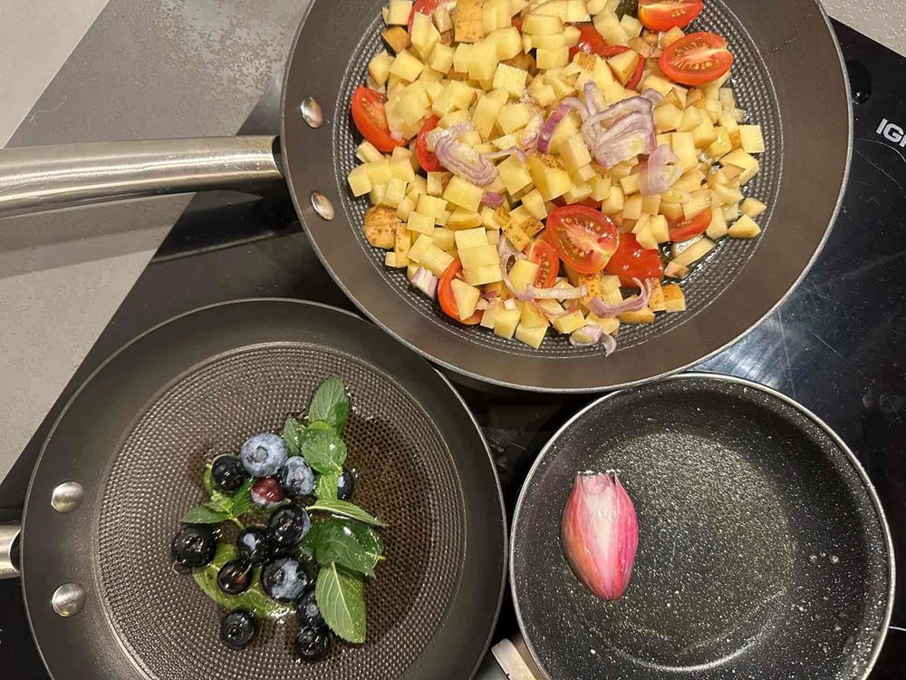 Krumpir , pomidore i ljutiku smo pekli pa kuhali posebno, borovnicu i mentu na drugoj tavi dok smo luk ljutiku pržili na trećoj. Na ovaj smo način sačuvali izdvojene okuse spomenutih namirnica koje ćemo sada sljubiti u našemu tanjuru na sljedeći način: