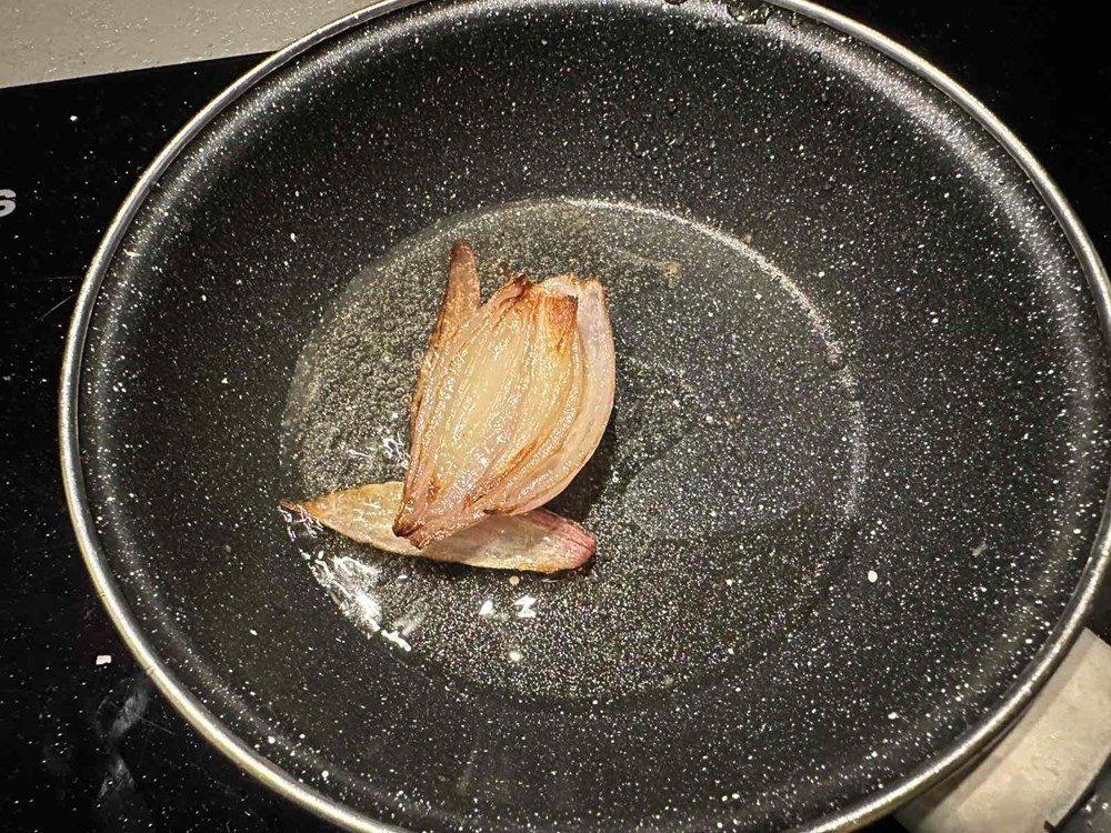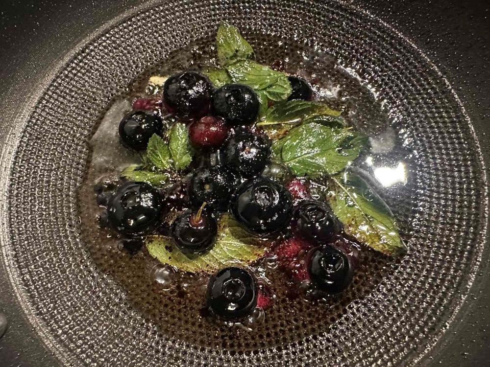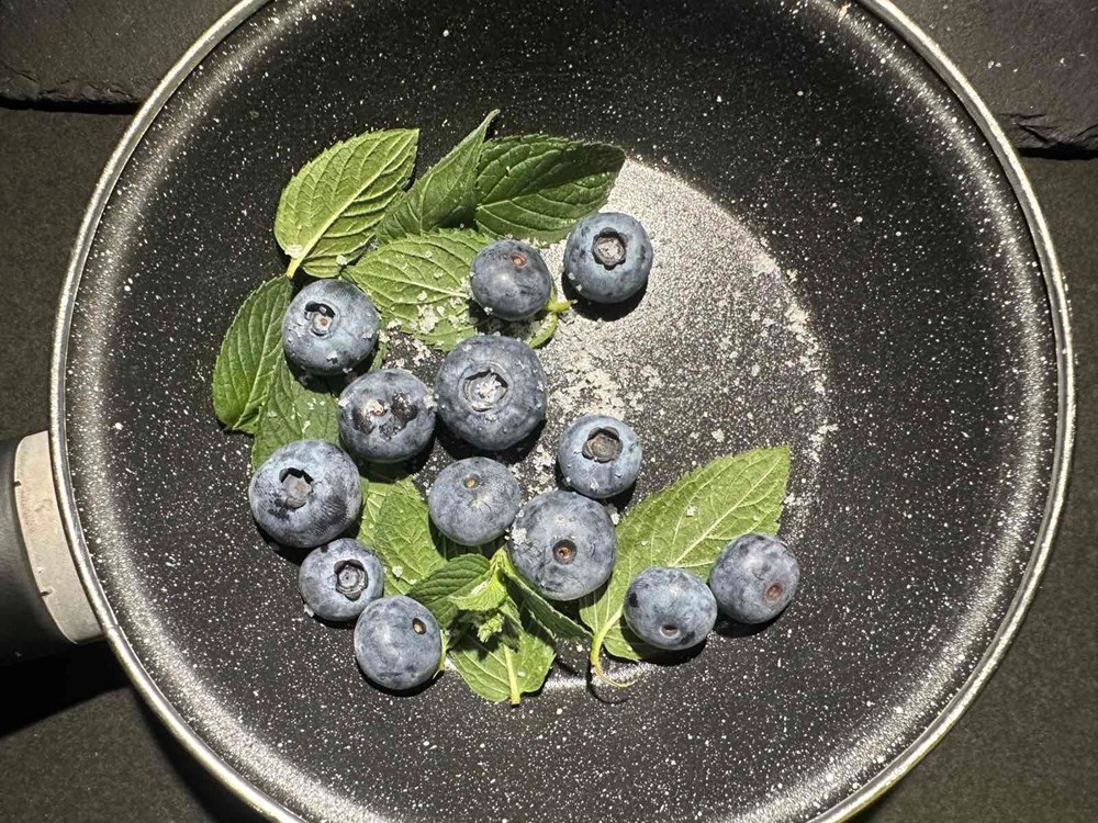 Istovremeno na manjoj plitkoj tavi na zagrijanom maslinovom ulju stavite pržiti bobice borovnice, 7 listova mente i trećinu čajne žličice cvijeta morske soli. Nakon nekih 5 minuta maknite tavu s izvora topline. Istovremeno kao i ove dvije tave stavite u najmanju tavu pržiti polovice luka ljutika. Pržite cca 2 do 3 minute sa svake strane pa maknite tavu s izvora topline.