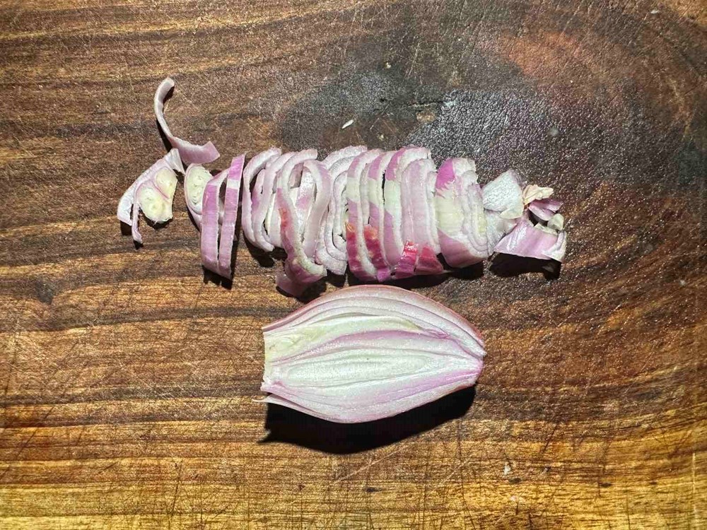 Narežite mladi krumpir zajedno sa koricom (nemojte ga guliti) na kockice veličine graška. Cherry pomidore razrežite na polovice. Tri glavice luka ljutike razrežite na polovice. Po jednu polovicu od svake ostavite cijelu dok druge polovice narežite na tanke trakice.