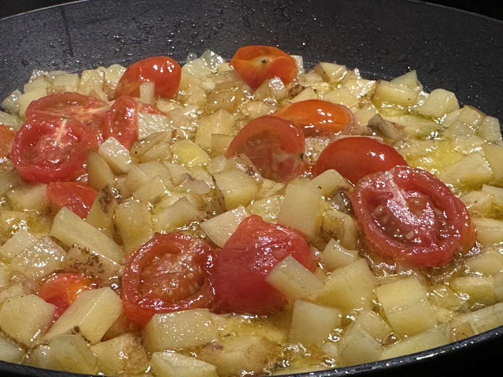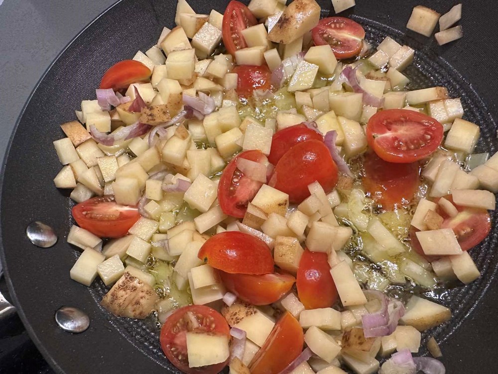 U poludubokoj tavi na zagrijanom maslinovom ulju dodajte nasjeckani krumpir, cherry pomidore na polovice, luk ljutiku narezanu na trakice i prstohvat cvijeta morske soli.