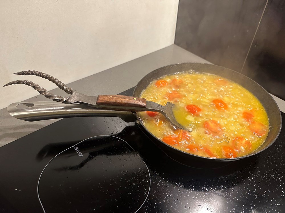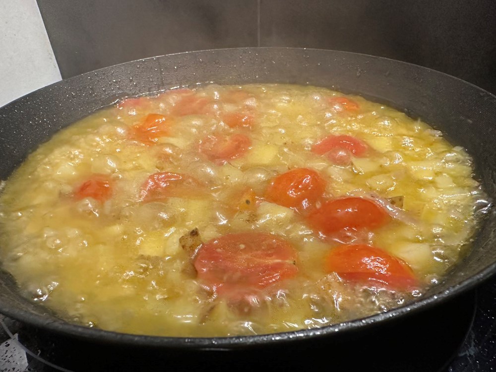 Prvo pržite oko 5 do 7 minuta na jakoj vatri i maslinovom ulju uz povremeno lagano miješanje. Dodajte zatim 0,5 l vode i kad voda zakipi lagano ali konstantno miješajte a vatru pojačajte na maksimum. Nakon nekih 7 minuta maknite tavu sa izvora topline.