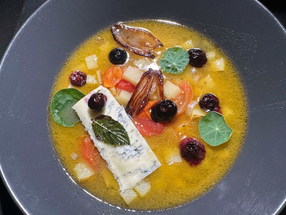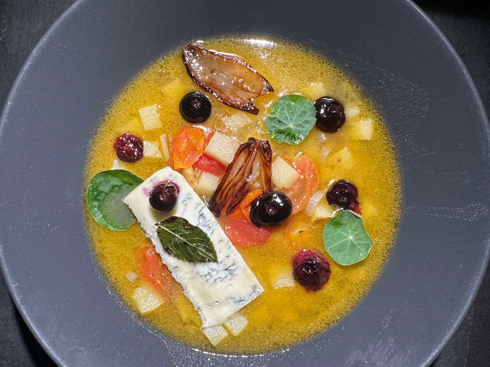 U tanjur velikom žlicom, a može i kacijolom stavimo juhu i komadiće krumpira, ljutike i cherry pomidora koje smo kuhali u tavi. Iz druge manje tave jušnom žlicom ili pincetom dodamo plodove borovnice a uz plodove borovnice sa strane u juhu stavimo i polovicu pržene ljutike. Sa strane u juhu stavimo fetu od cca 4,5 do 5 dkg sira gorgonzole a na gorgonzolu stavimo bobicu borovnice i list pržene mente koju smo pržili zajedno sa borovnicom.