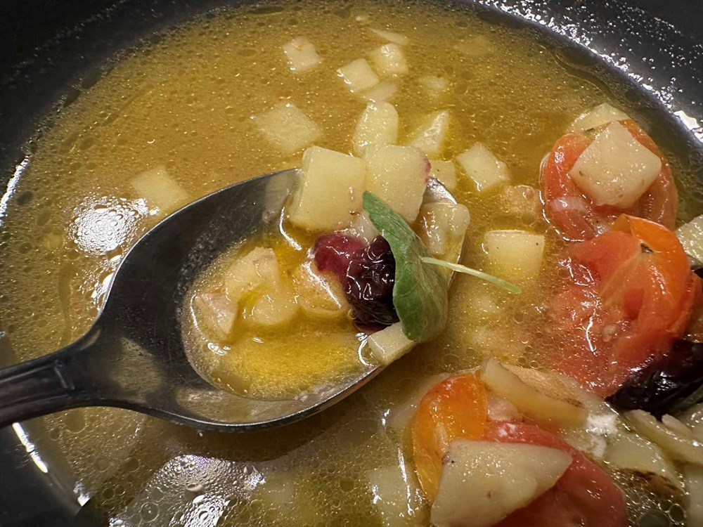 Tnx, amico, kažem ja njemu… dao si mi super ideju za recept, za koju uru kad dođem na kopno doma na Verudu Porat izradit ću nekakvu riblju krem juhu… po putu ću smisliti detalje… pozdravljam se sa svojim kolegom Markom, odrađujem još par sitnica po hotelskoj kužini, odlazim pod leden tuš, pa pravo na brod što vozi prema Fažani… plovim morem pa zatim plovim kopnom u moru turista probijam se prema svom "oldschool alfaromeu" upadam, palim klimu i namještam ju na "ledeno doba", istovremeno otvaram sve prozore u autu… palim muziku, a Iggy Pop uzvikuje: "Home Boy! Home Boy!" Vroammm! Stižem kući… Uzimam domaći mladi vidulinski krumpir, luk ljutiku, uzimam i borovnice… i onda pogled mi zapinje na drugu policu s lijeva u frižideru, tamo se nalazi ona, prekrasna plava gorgonzola, bez razmišljanja s osmjehom na licu i uzbuđenjem u srcu ju uzimam i stavljam na orahovu dasku za rezanje … uzimam zatim i oradelu ugodno smještenu u inox posudu mojeg frižidera ulovljenu tu u blizini podno otočića Fraškerić odmah ispod Verude… i dok ju gledam u njene tamne i tužne okice govorim joj telepatski… "Sorry babe, ali danas ništa od tebe", i vraćam ju opet nazad u frižider. Pa kao da baš moram napraviti gustu riblju juhu… ja sam slobodni mislilac , pogonjen strastima koji žive u mojim mislima odlučio sam se za gusti minestrone a kao izvor bjelančevina koristit ću ovu prekrasnu fetu plave gorgonzole koju ću na samome kraju ubaciti u pjat… radit ću fuzijski izdvojeno na tri tave kako bih sačuvao i izdvojio okuse određenih namirnica u minestrone pa onda pred sam početak konzumacije dijelove okusa oprezno spojiti u tanjuru… dakle… 3,2,1… započnimo i ovu priču…