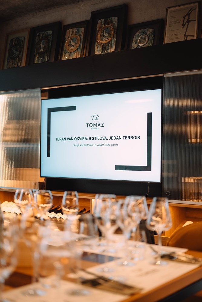 U modernom ambijentu Vinarije Tomaz u Motovunu, 12. veljače 2026. godine održan je stručni okrugli stol pod nazivom „Teran van okvira: 6 stilova, 1 terroir“, jedinstven susret posvećen jednoj od najvažnijih autohtonih hrvatskih vinskih sorti – Teranu.