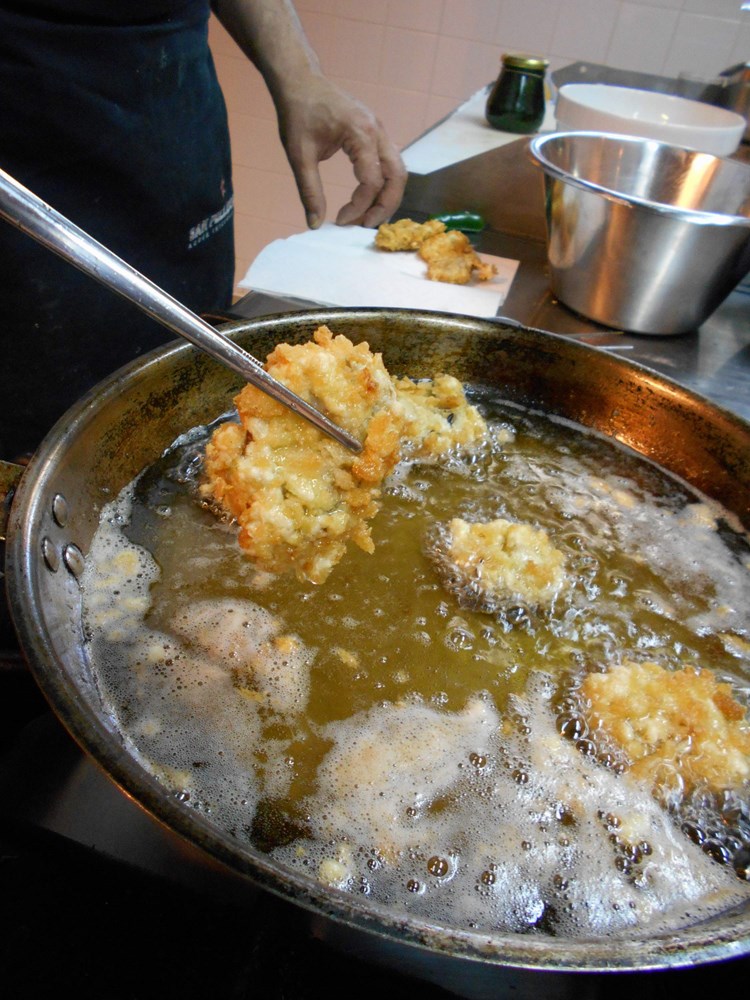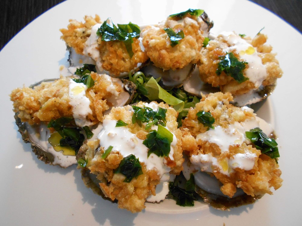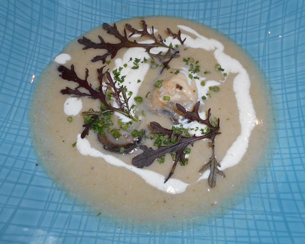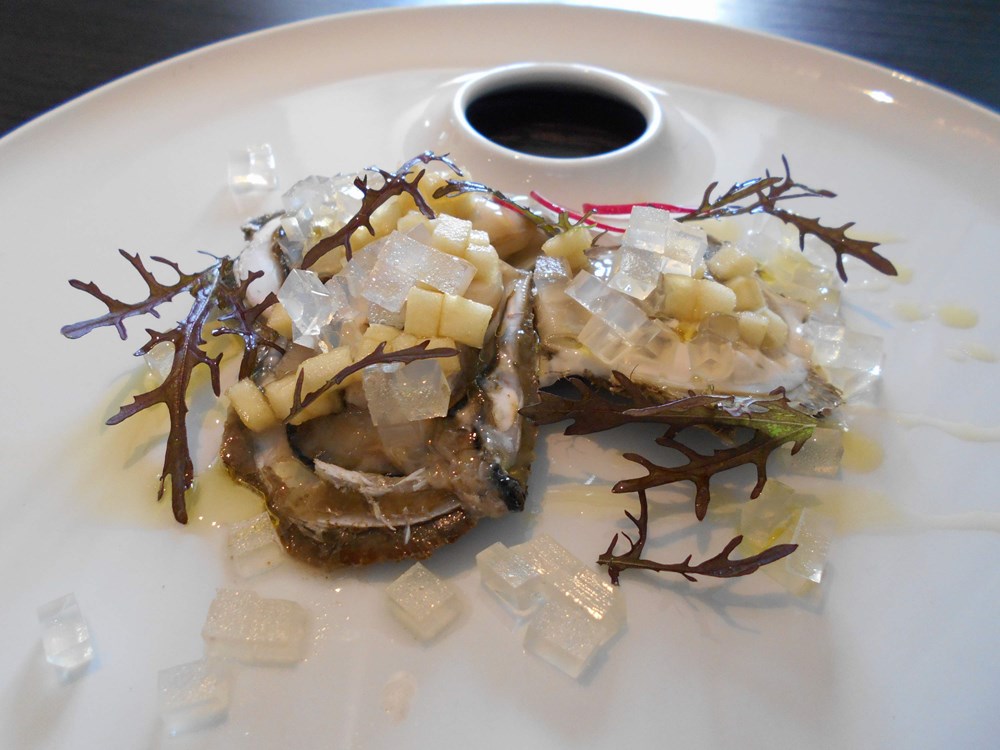 U sljedeća dva jela klasične su kamenice pretrpjele prilično veliku promjeru u odnosu na klasičnu ponudu. Drugo su jelo naime bile kamenice pohane u hrskavim panko mrvicama, koje su zatim prelivene "lažnom" majonezom od sojinog mlijeka, maslinovim uljem i češnjakom, te posipane medvjeđim lukom, prethodno blanširanim i odležanim u maslinovom ulju. Ovakav način pohanja kamenicama ne samo da daje vrlo osebujnu aromatiku, već i njihovu konzistenciju omekšava i pretvara u moguću zanimljivu zagonetku za kušače, ukoliko im se ne kaže unaprijed što zapravo kušaju. Treći način pripreme kamenica je - juha. Kamenice se naprosto kuhaju u veluteu od ribljeg temeljca, zatim se sve izblenda, propasira, i u tanjuru ukrasi s tri svježe očišćene kamenice i malo vlasca.