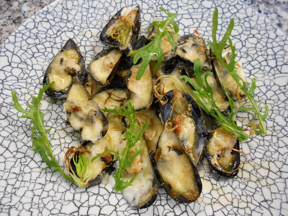 Malo je složenija priprema sljedećeg jela, gratiniranih pedoća. Najprije ih treba zapeći u pećnici odnosno konvektomatu, tek minutu da se otvore. Otvorene pedoće zatim se nadjene bešamelom, domaćim ovčjim sirom, rezanim porilukom i mrvicama, i zatim ih se zapeče u pećnici na 180 stupnjeva desetak minuta.