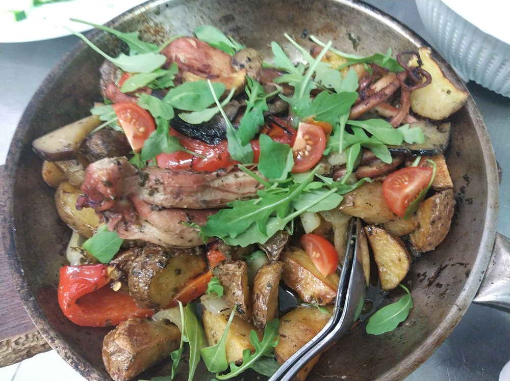 Priprema: Prokuhamo hobotnicu u kipućoj i slanoj vodi, te ju procijedimo. Krumpir izrežemo na četvrtine i na pola ga prokuhano i ocijedimo. Gore navedeno povrće narežemo na trakice te ga na pola ispržimo na tavi na malo maslinovog ulja, soli i papra. U tavu u kojoj se nalazi povrće dodamo narezanu hobotnicu (na krupno, po dva kraka zajedno), prokuhani krumpir, ubacimo 5 - 6 maslina i veliku jušnu žlicu kapara. Sve to prelijemo s 0,5 dl. bijelog vina i stavimo u pećnicu na 180 stupnjeva Celzija, da se peče 25 do 30 min.