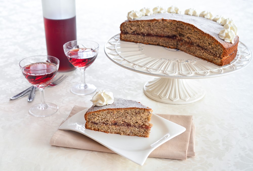 Priprema: Pjenasto izmutiti maslac i ½ količine šećera, dodati žumanjke jedno po jedno. Umiješati brašno, bademe i vaniliju. Od bjelanjaka i preostalog šećera istući čvrsti snijeg i rahlo umiješati u prethodno pripremljenu smjesu. Tijesto uliti u kalup za tortu i peći na 180°C . Ohlađenu tortu razrezati na pola i namazati marmeladom i spojiti dvije polovice te posipati šećerom u prahu.