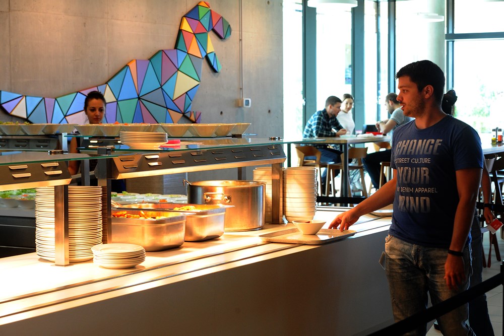 Izgleda da ni menza nije ono što je nekad bila, barem kada je najjača hrvatska it tvrtka "na tanjuru". Dodamo li pritom čak 15 vrsta salata - quinou s povrćem, capresse sa sirom, salatu od krastavca sa jogurtom, od graha, cikle, kupusa, piletine nadilazimo granice obične menze. Tu je i standardna punjena pohana piletina sa sirom i ne standardnim pomfrijem ili pireom, već zlaćano hrskavim pole krumpirima te riža s pečenim povrćem i kuhano pečeno povrće kojemu ne mogu odoljeti ni zagriženi mesojedi.