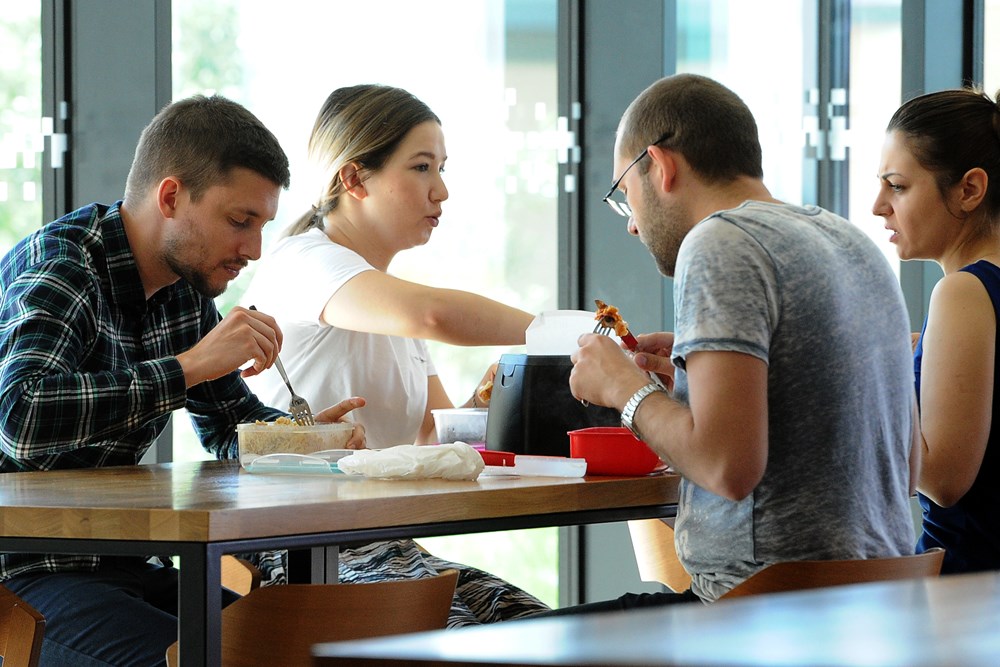 U kuhinji atmosfera radna, u cijelom prostoru glazba opuštujuća, ugodni indie i nema mirisa užeglog ulja menze ili velikih restorana. Kako ne bi došlo do zabune ili se ne bi skuhalo previše ili premalo hrane, porcije se naručuju dan prije putem, logično za zaključit kad je Infobip u pitanju, aplikacije. Dakle, prisloni se kartica na elektronički uređaj koji očita ono što je naručeno sa tjednog menija i iznos se skida sa plaće