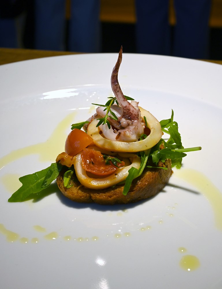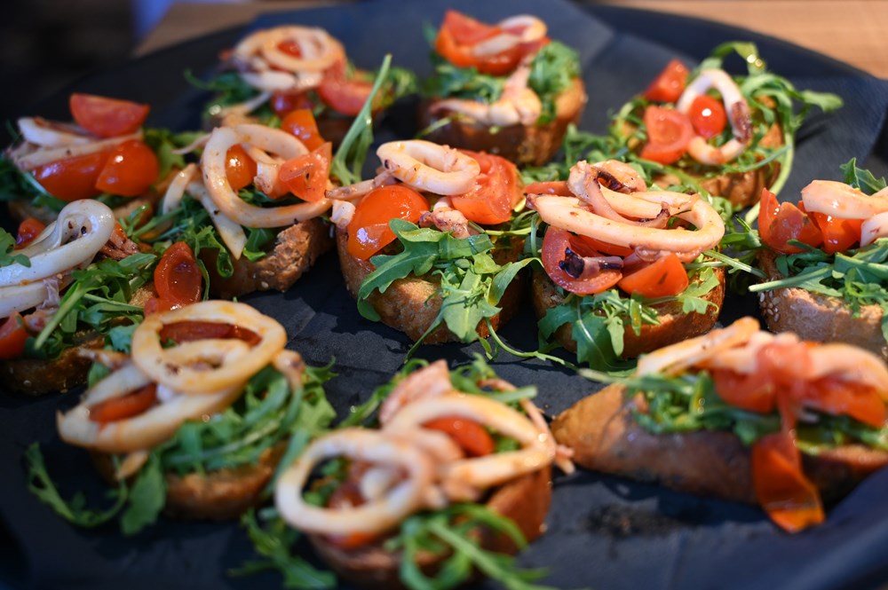 - Uz njih idu tjestenine, rižota, hladna i topla jela, ali mi smo danas pravili bruskete. Malo je namirnica potrebno za ovo jelo: osim lignji, tu je rukola, cherry rajčica, maslinovo ulje i timijan. Jednostavno, a jako ukusno. Vrlo je važno pratiti lignje da se ne prepeku. Bruskete smo vrlo jednostavno napravili, narezali smo kruh, prelili ga lagano maslinovim uljem i zapekli u rerni, veli Modrušan.