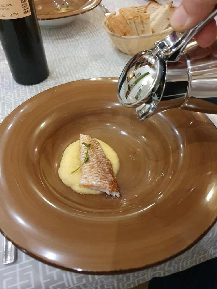 Opet more u petom slijedu. Trilja s paletom i bujonom od istarskog pršuta. Totalna dekonstrukcija ribe. Servirana u dubokom tanjuru za juhu, trilja s palentom i hrskavom koricom kao mali gastro eksces kupalo se u bujonu od istarskog pršuta koji je konobar natočio. Trilju smo jeli žlicom. Okus mora bio je na mjeru izražen i da, hrskava korica bile je deliciozna. "Volim obraz, repove, srdele, trilju, jeftine komade koji su najbolji. Po čemu je jedna srdela bolja od jastoga, pita nas. A odgovor je u delicioznoj obično neobičnoj trilji.