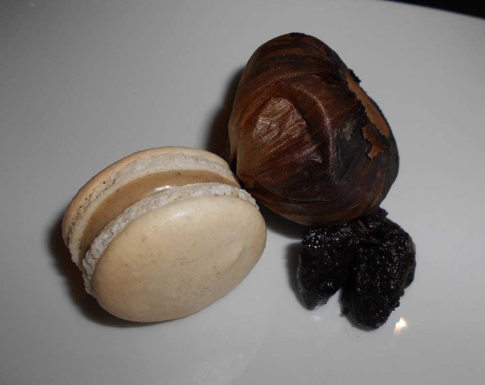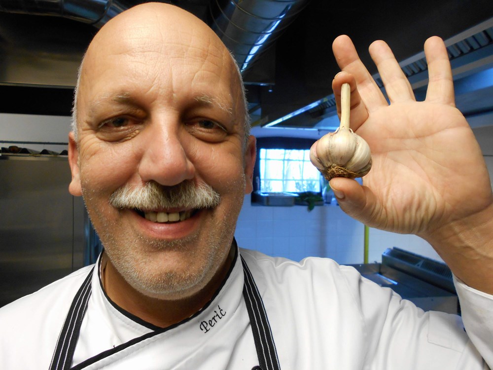 Češnjak ima svoje mjesto i u desertima, a Perić je ovaj put koristio fermentirani crni češnjak, koji je potpuno izgubio ljutinu i poprimio baš za deserte vrlo podatnu slatku aromu. Chefova je ideja napraviti macaronse s kremom od češnjaka. Za plosnate polovice koje se spajaju kremom umijesio je brašno od badema, šećer u prahu, snijeg od bjelanjaka i šećer i polovice pekao 12 minuta na 150 stupnjeva. Krema je napravljena miksanjem i topljenjem bijele čokolade, zakuhanog slatkog vrhnja i fermentiranog češnjaka.