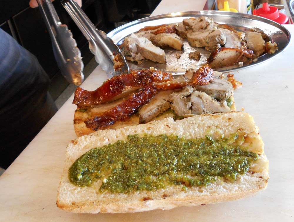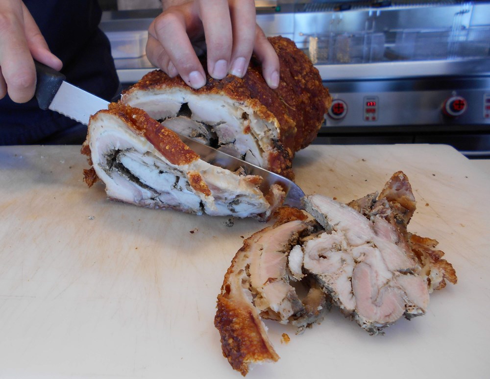 Drugo jelo koje za ovu priliku izdvajamo je porchetta sendvič, a početak njegova nastajanja je pečenje zarolanog svinjskog carskog mesa, zajedno s kareom odnosno žlomprtom, uz dodatak soli, papra i varijante pesta koji se priprema od bosiljka, sira, pinjola, oraha i istarskog maslinovog ulja. "Štruca" tako začinjenog carskog mesa dugačka pola metra, a promjera tridesetak centimetara biva teška 8-12 kilograma, ovisno koliko je velik bio prasac. Peče se u pećnici na ugljen 4 do 5 sati. Pečena porchetta čeka naručitelje. Kad treba složiti sendvič, onda se sa štruce nareže koliko treba za jednu porciju, to se zatim podgrije u pećnici, nasjecka na komadiće i time se, zajedno s pestom, nadjene posebno pecivo, ciabatta u čije je tijesto bio umiješan prženi luk.