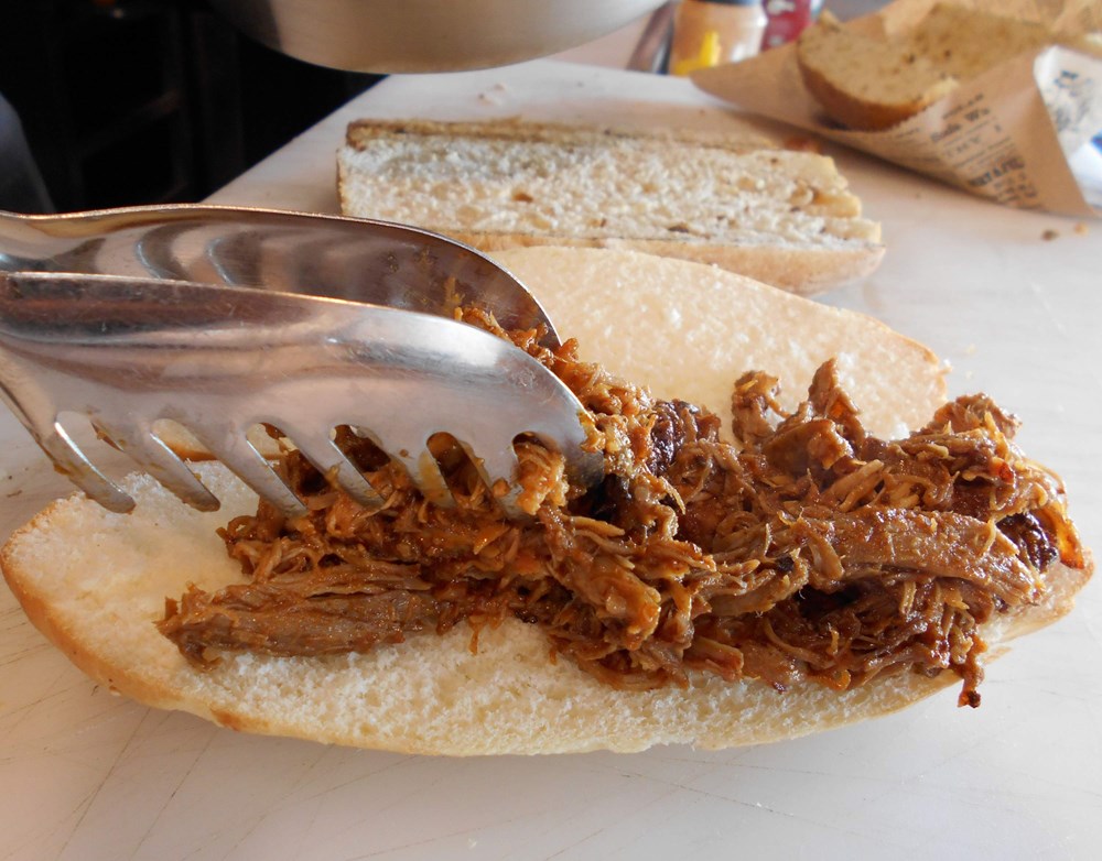 Sljedeći zanimljivi sendvič je, reći će Luka Radoš, američki barbecue klasik: sendvič s trganom svinjetinom odnosno "pulled pork". Ako su se prethodna jela pripremala dugo, što tek možemo reći za ovo, za koje se začinjena svinjska plećka sporo peče punih devet sati na temperaturi od 110 stupnjeva, i to još u pećnici na ugljen. Pred serviranje pečena plećka se rastrga prstima na male komadiće, time se uz dodatak barbecue umaka nadjene hot-dog brioš pecivo, i servira uz kupus na salatu i prženi luk.