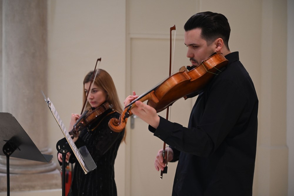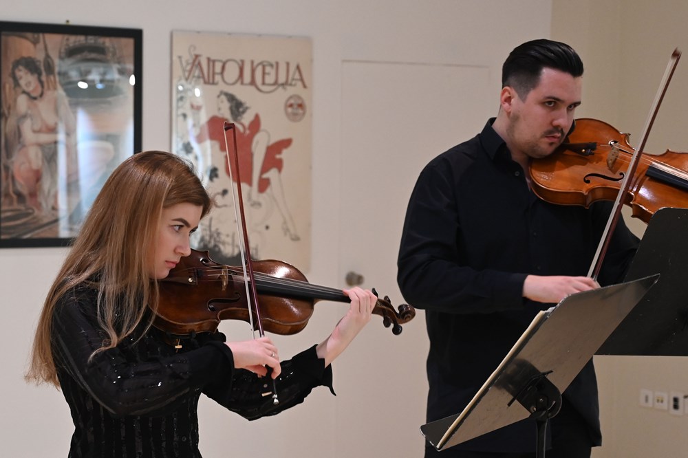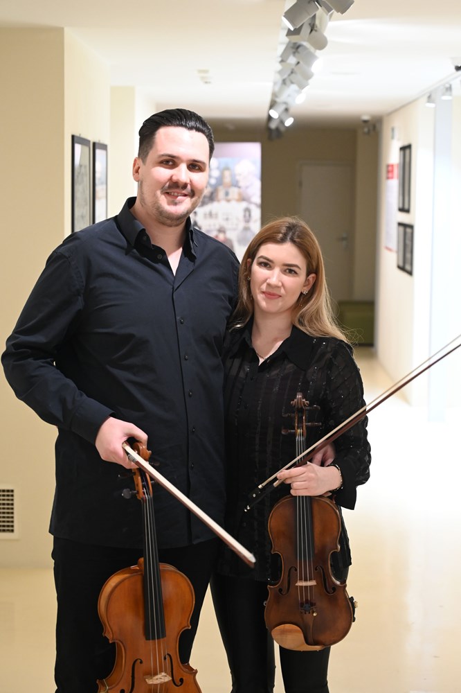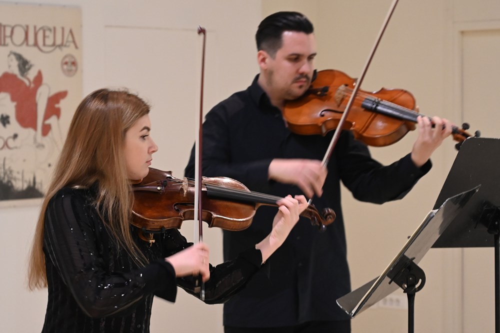 Iznimno brojna publika bila je poticaj za ovaj duo, da pokaže svu pripremljenost, tehnički besprijekornu izvedbu, uz pažljivo osmišljen scenski nastup i odnjegovanu muzikalnost, te poveo ih je putovanjem kroz razne glazbene epohe. Počelo je uz velikana svjetske glazbe, W. A. Mozarta i ''Gudački duo br. 1 za violinu i violu u G-duru, K423'' sa stavcima Allegro, Adagio i Rondeau, Allegro, što se pokazalo izvrsnim odabirom za prikazivanje mogućnosti tih instrumenata i njihov dijalog i interakciju.