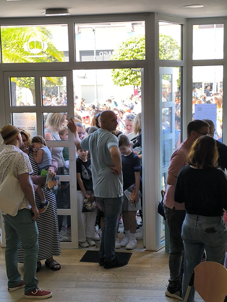 Val oduševljenja nastao je kad se Baby Lasagna pojavio pred masom razdragane djece i zajedno sa direktorom knjižnice Nevenom Ušumovićem i predstavnikom izdavačke kuće Rockmark Krešimirom Blaževićem pozdravio okupljene.