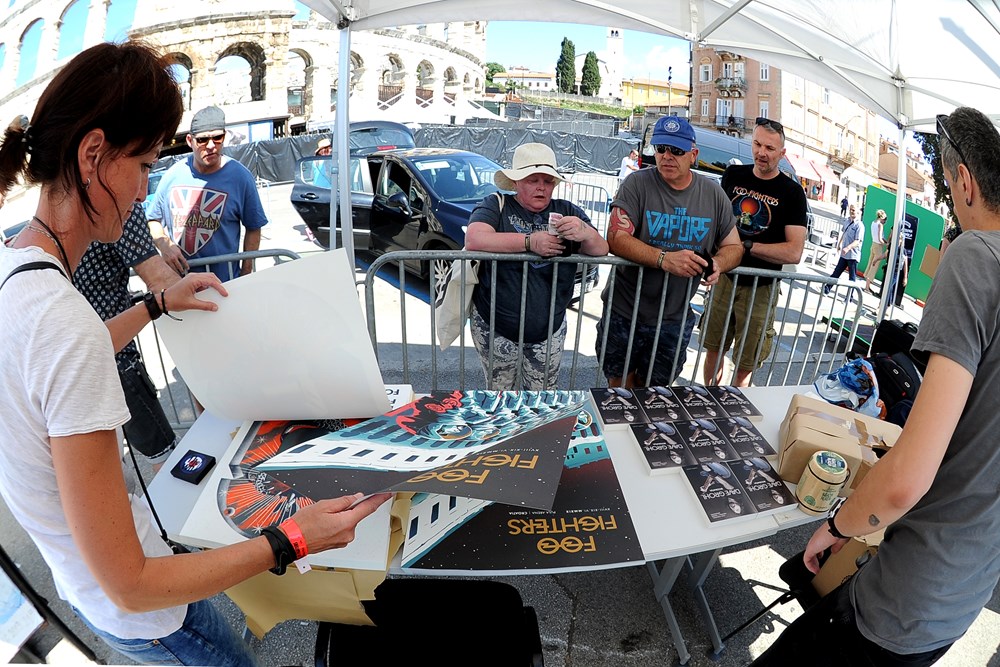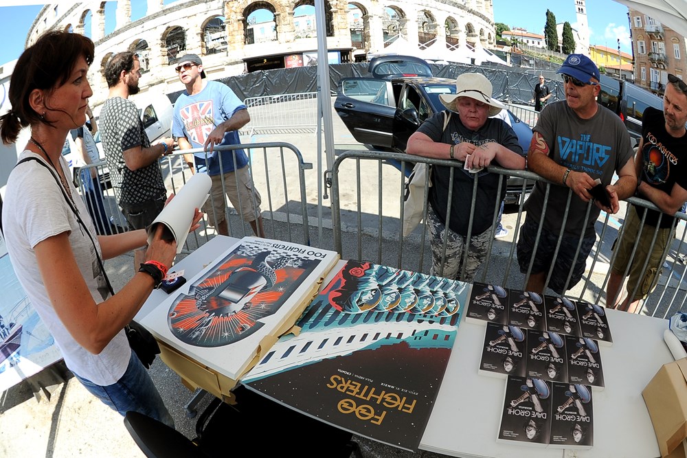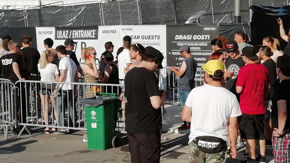 Uzbuđenje, ono fanovsko osjeća se na daljinu. To je onaj osjećaj s leptirićima u stomaku. Okistocin. Prava ljubav. Fan zona je definitivno ispred prvih ograda koje su obložene crnim najlonom. Da, Arena je zavijena u koncertno crnilo, zbog koncerta i na tisuće njihovih ljubitelja koji su karte kupili u nekoliko minuta što se nikada nije dogodilo u hrvatskoj koncertnoj povijesti, pa ni onoj pulske Arene. "Nije lijepo što su crnim najlonom zavili Arenu, pa ljudi ne mogu gledati izvana. Tužno, jer je atmosfera već sada fantastična", komentira Škot Stewie dok sa suprugom Alayne čeka na klupicama ispred "doktorske kuće" nasuprot amfiteatra. Simpatični su, istetovirani, vremešni i mladi u srcu iako se on šali da je star i penzić jer ima 61 godinu. Ipak je žena ta koja je prava obožavateljica. Prava fajterica! Takva da prvi dan ide sama na koncert, a drugi sa suprugom. "Jutros sam kupila kartu preko Facebooka, nadam se da će biti prava. Karta nije skupa. Košta 350 kuna, u Škotskoj bi to koštalo 430 kuna. Jako sam uzbuđena. Moj suprug voli muziku. Ja volim muziku, obožavam Davida Grohla i sunce. Hrvatska je divna. Mislim da ćemo se vratiti s prijateljima ", oduševljeno će 59-godišnja Alayne. Pulski koncert ih je natjerao da prvi put odu na odmor izvan otoka jer su se do tada, šale se, samo vozikali po Škotskoj.