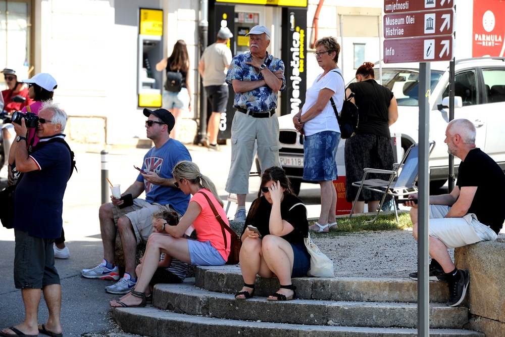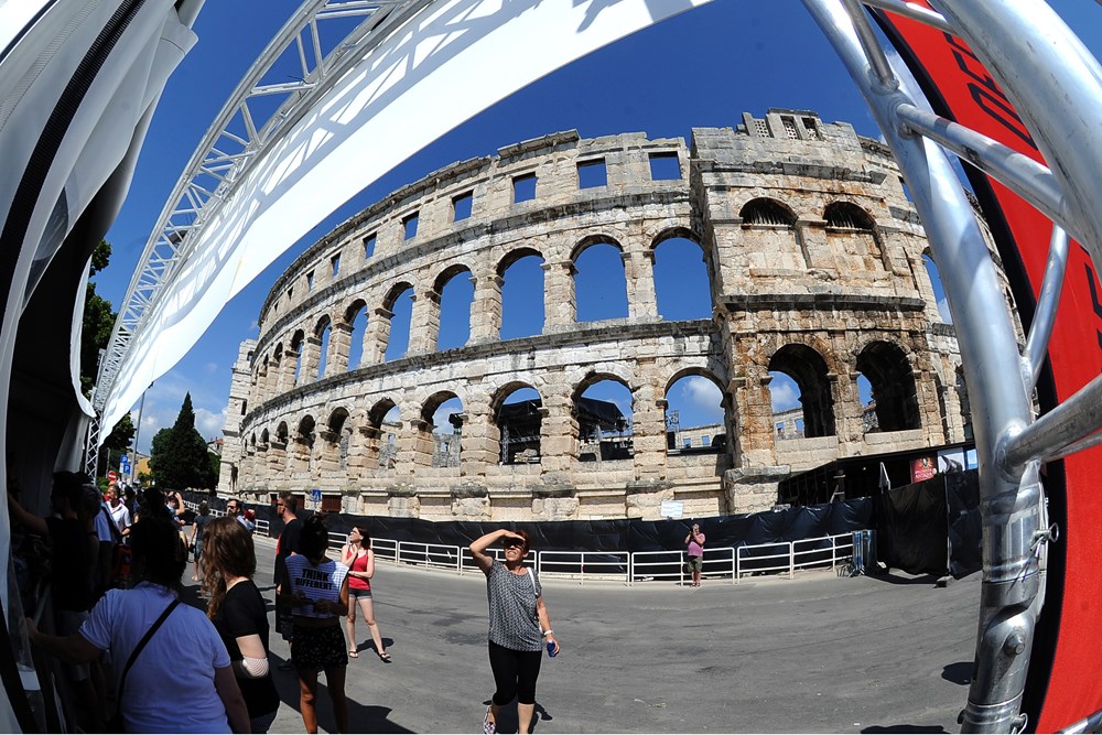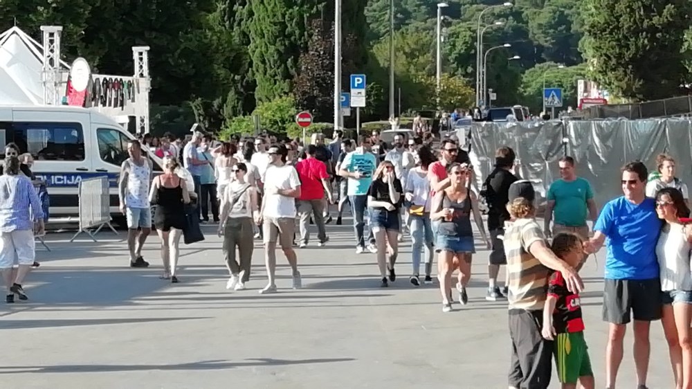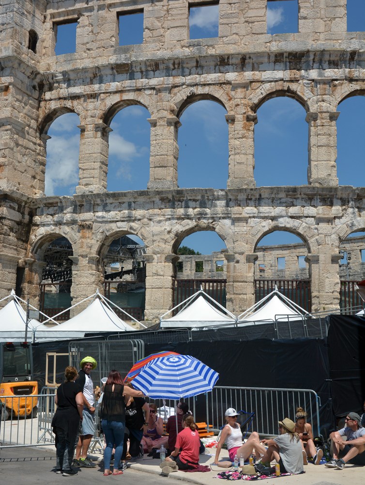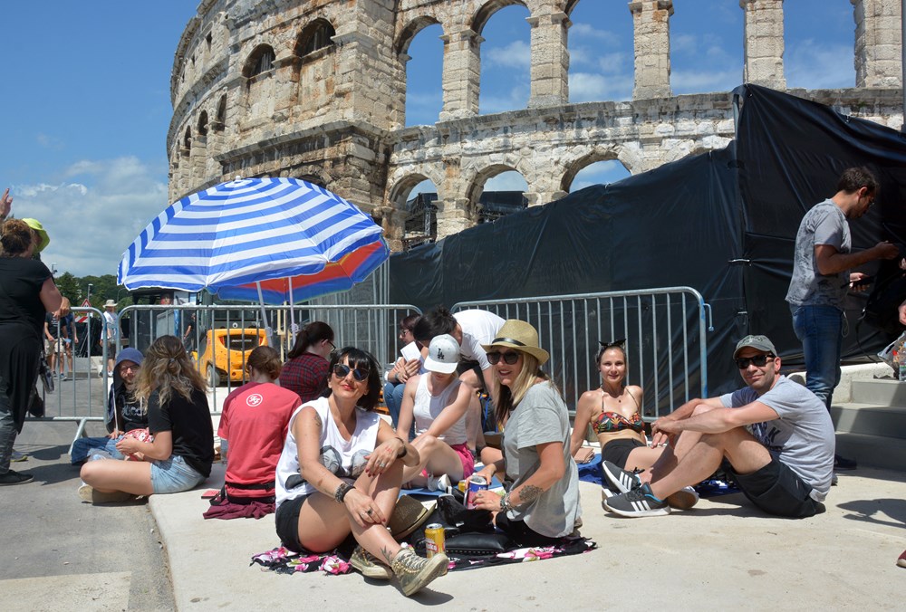 "Možemo li onda na hrvatskom", pitamo. "Razumijem sve" ljubazno će Marija. "Cijeli dan smo ovdje i atmosfera je odlična. Tri puta smo ih gledali na Novom Zelandu, a sada smo kupili karte za dva dana, uzbuđeno nam veli mladi novozelanski bračni par. On porijeklom iz Makarske, a njezini su korijeni iz Slavonije i Korčule. U Puli nisu prvi put. Prije šest godina trebali su i oni nastupati u Areni, ne s bendom, već folklornim ansamblom Kolo s Novog Zelanda. No, zbog nekog velikog koncerta nisu nastupili u amfiteatru, već na Kaštelu, tako da će Arenu ovoga puta guštati duplo. Karte su kupili za dva dana. Jer, dvaput je dvaput.