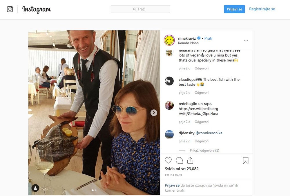 Osim niza fotografija s nastupa i napisane riječi "Hvala!" za publiku i domaćine Sea Star festivala, na Instagramu je objavila i fotografiju iz restorana u kojem je odabrala ribu grdobinu, čiji joj izgled nije prijao koliko je kasnije njezin čuveni ukus kad je riba bila spremljena na majstorski način. Dan je završila uz zalazak sunca na motovunskim zidinama, uz fotografiju na kojoj upija sunce s društvom.