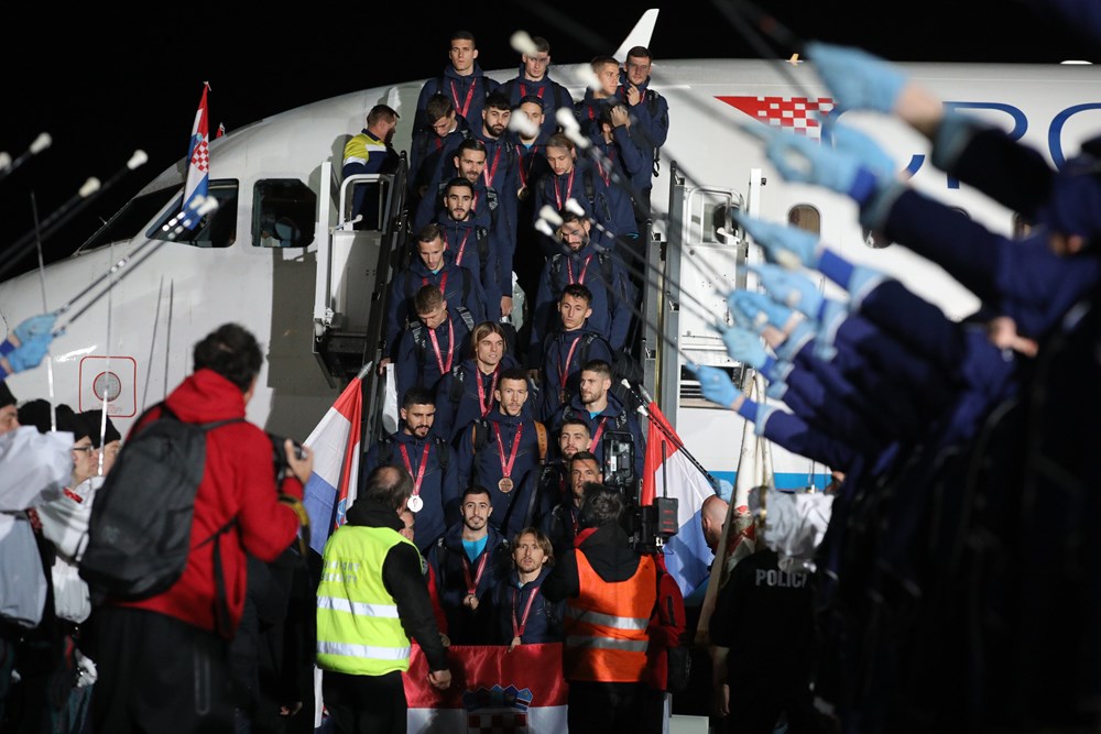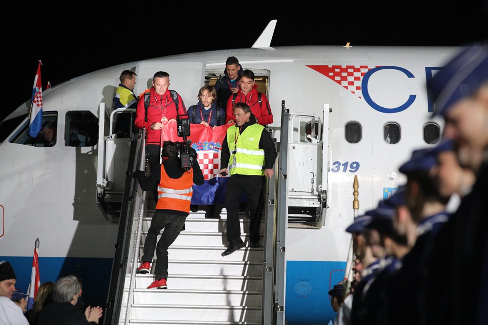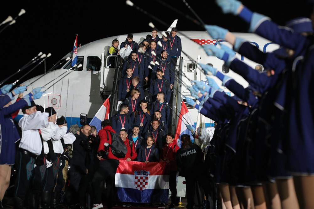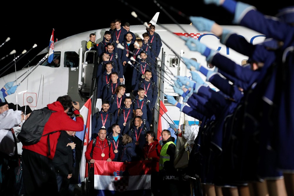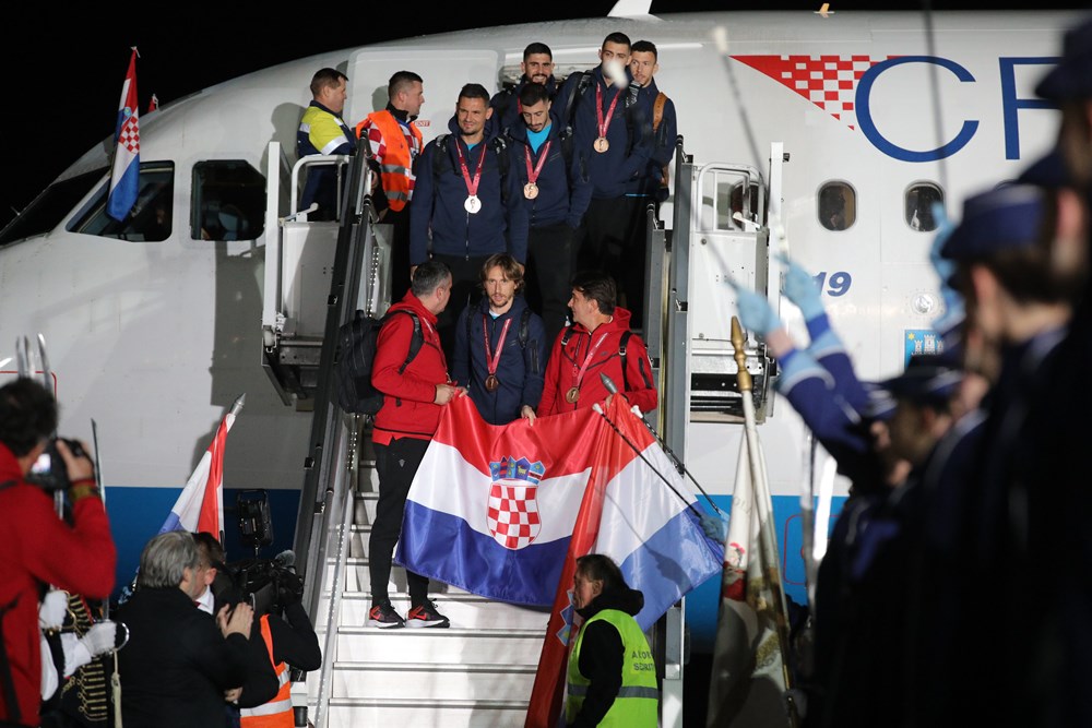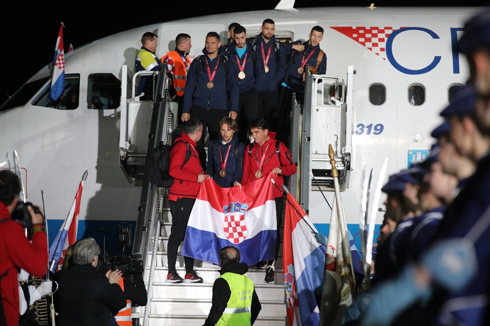 Zrakoplov je sletio u 17,26 sati u zračnu luku Franjo Tuđman, gdje osvajače trećeg mjesta na Svjetskom prvenstvu u Kataru dočekuju navijači oduševljeni novim nogometnim uspjehom, nakon osvojene bronce 1998. u Francuskoj i srebra 2008. u Rusiji.