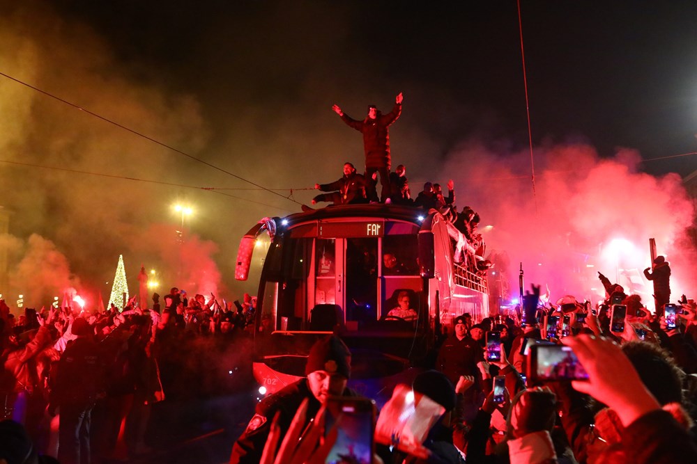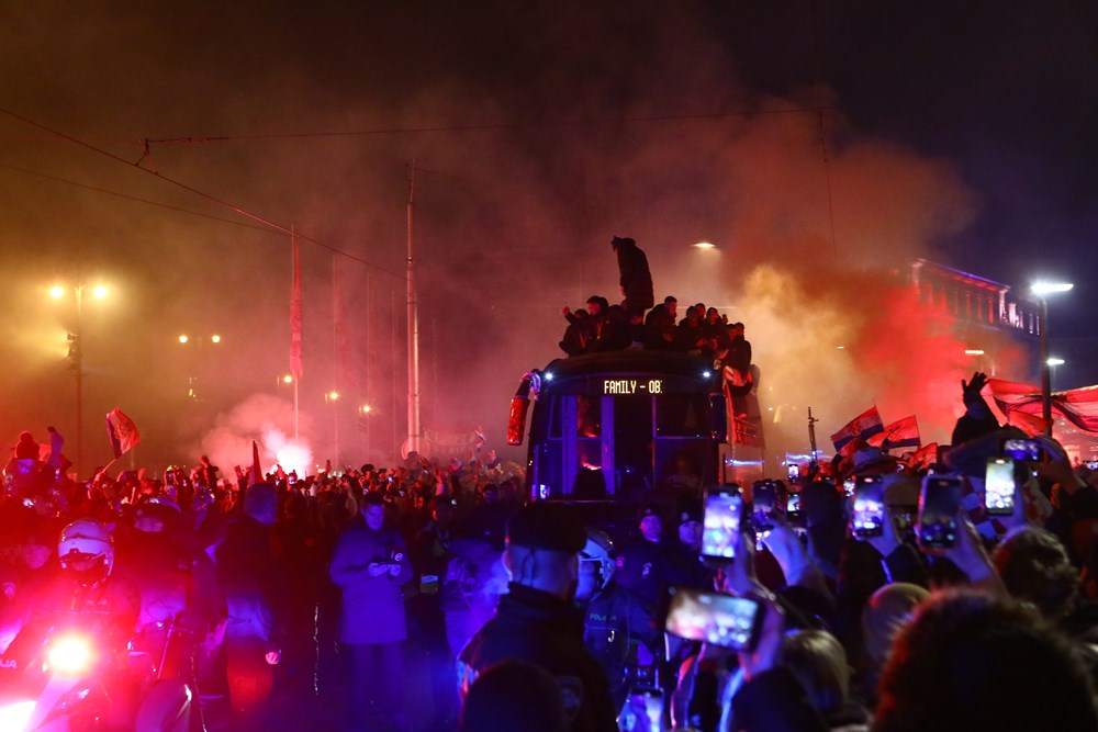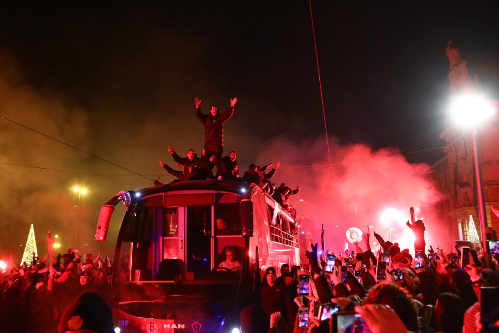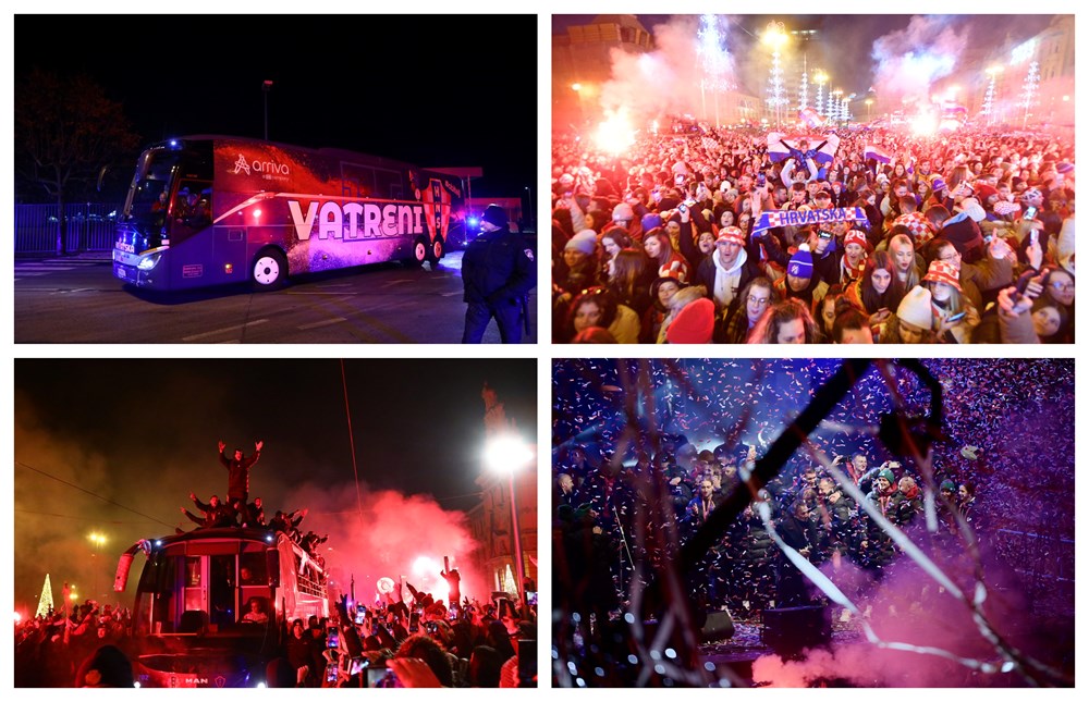 Vatreni su se kod vatrogasne postaje na Savskoj ulici prebacili u otvoreni autobus kojim se voze do Trga. Tamo ih čekaju deseci tisuća navijača koji se zagrijavaju uz Zaprešić Boyse, prenosi Jutarnji list.