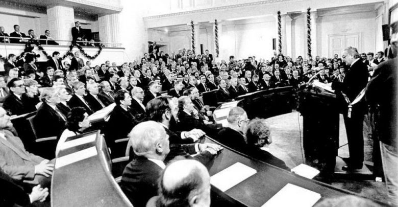 Prvi demokratski saziv Hrvatskog sabora 30. svibnja 1990. održan je u mirnoj i svečanoj atmosferi koju nije pokvarila ni grupica ljudi koja je ispred ulaza u sabornicu na Markovu trgu - koji se tada još zvao Trg Stjepana Radića - klicala parole protiv tadašnjeg predsjednika Saveza komunista Hrvatske i izbornog gubitnika Ivice Račana. Račan se na to - kako svjedoče novinari koji su (poput vašeg novinara) pratili konstituiranje višestranačja u Hrvatskoj - nije osvrtao.