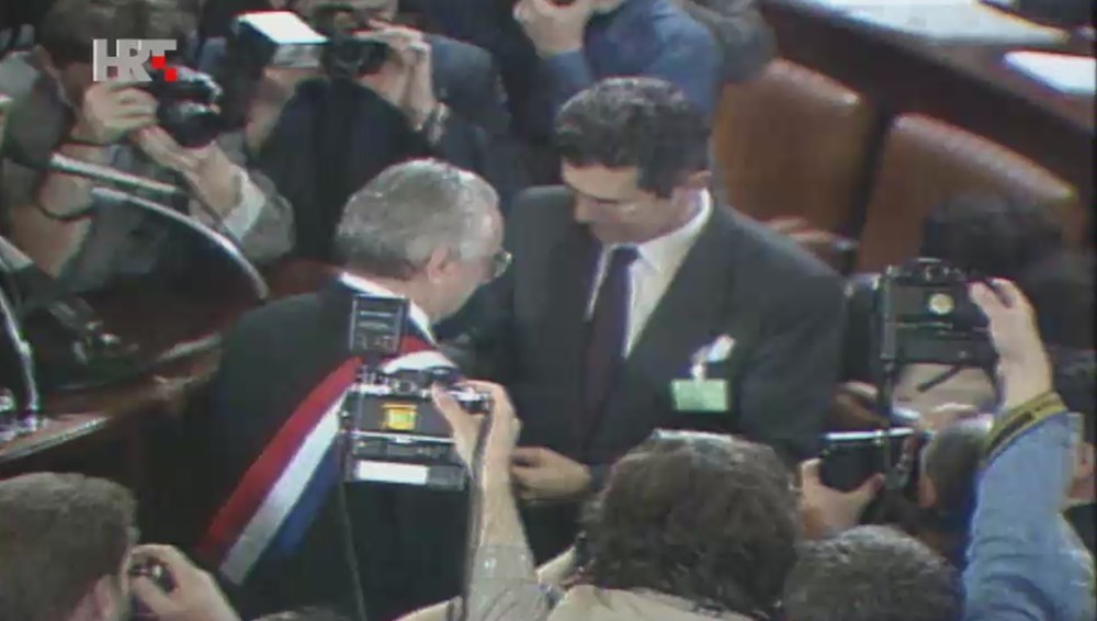 U velikoj dvorani Hrvatskog sabora koja je izgledala, kao i čitava unutrašnjost parlamenta, posve drukčije nego danas, bilo je malo mjesta za sve koji su željeli biti nazočni na tom svečanom činu. Uzvanici, poput kardinala Franje Kuharića i predsjednika Islamske vjerske zajednice Šefka Omerbašića, sjedili su u prvom redu, došli su i predstavnici diplomatskog zbora koji je u to vrijeme u Zagrebu bio malobrojan (konzulate su imali SAD, Rusija, Francuska, Velika Britanija i Njemačka) te gomila novinara iz svih tadašnjih republika bivše države.