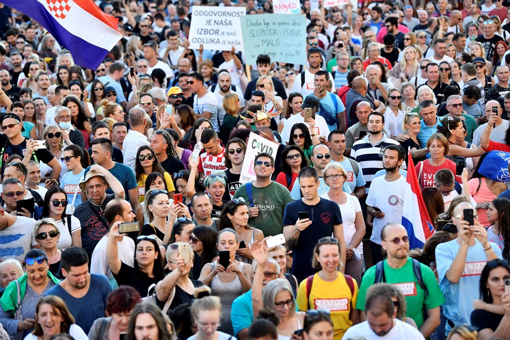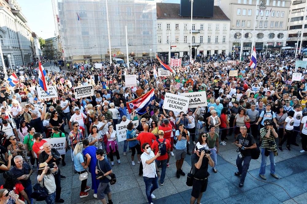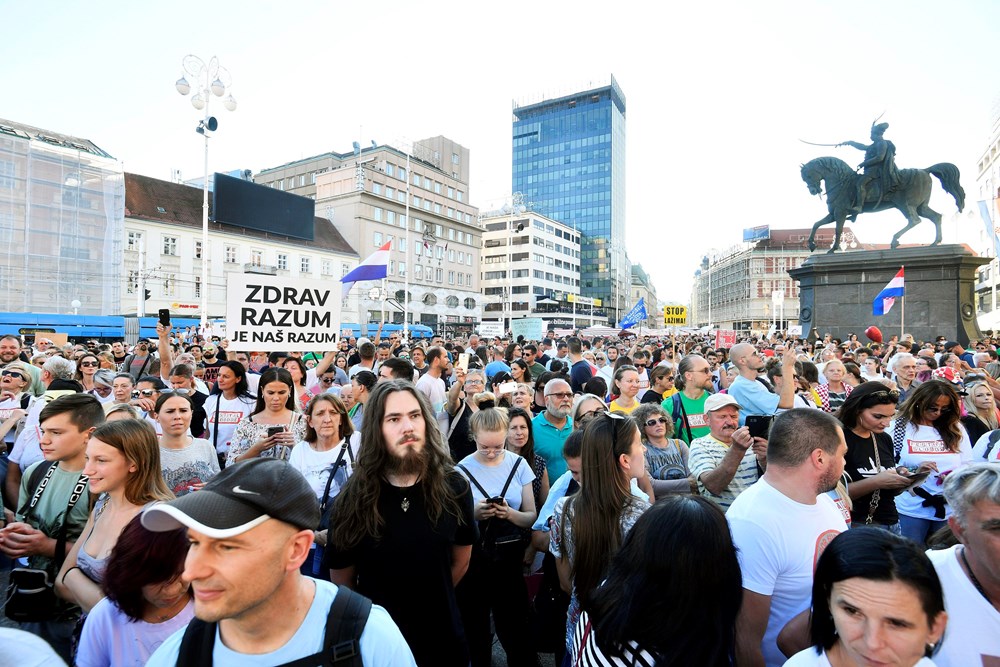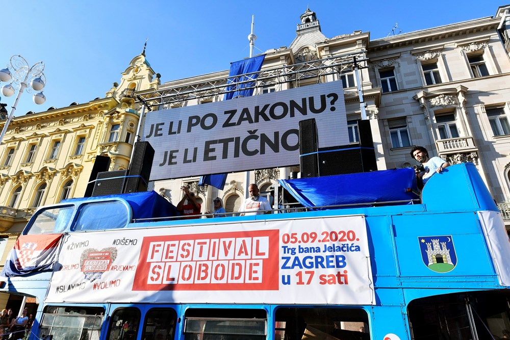 Više tisuća ljudi okupilo se u subotu na zagrebačkom Trgu bana Jelačića kako bi sudjelovali na prosvjedu Festival slobode koji je nastao kao odgovor na mjere za suzbijanje koronavirusa u organizaciji inicijative "Prava i slobode", piše Index.hr.
