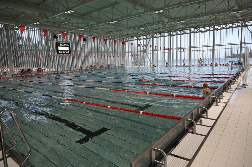Kompleks se sastoji od dva bazena - sportskog, obloženog inoxom koji ima pomično dno, i lječilišnog bazena s grijanom morskom vodom.