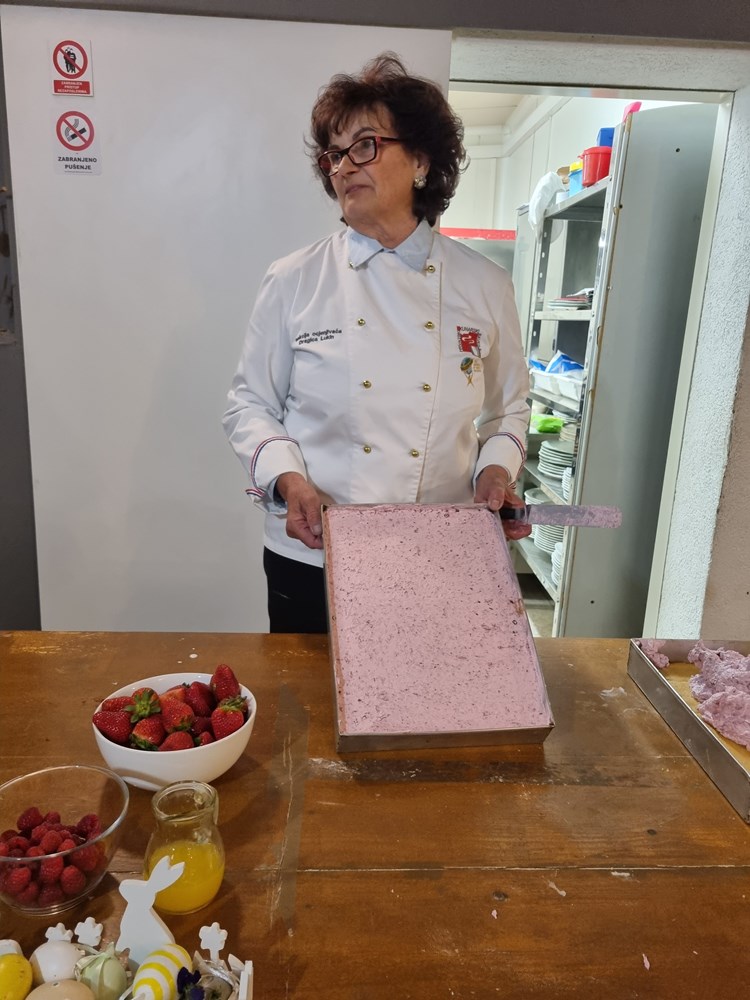 Uz asistenciju domaćice Darinke Buršić, Dragica je pripremila peciva od mliječnog, dizanog i masnog vodenog tijesta, a prvo što je izašlo iz pećnice bio je domaći kruh čijoj hrskavoj korici i mekanoj sredini nitko nije mogao odoljeti. Ne zna se je li više privlačio njegov miris, izgled ili okus. Šalimo se da je Dragica poput multipraktika - dok mijesi tijesto, istovremeno priprema biskvit za parfe kolač sa šumskim voćem, odgovara na pitanja, a pritom joj osmjeh ne silazi s lica. I to sve nevjerojatnom brzinom. Demonstraciju, a potom i degustaciju jela, pratile su i priče o tradiciji i običajima koji se vezuju uz Uskrs