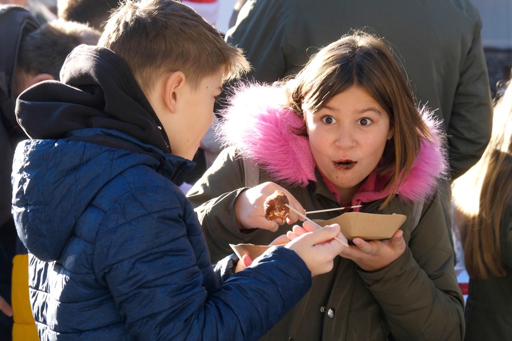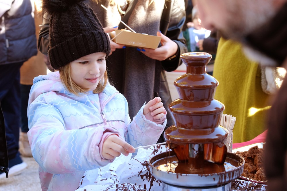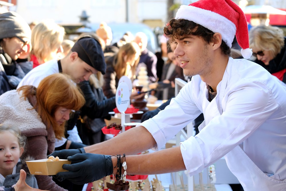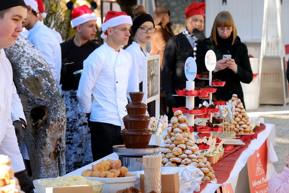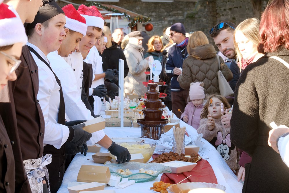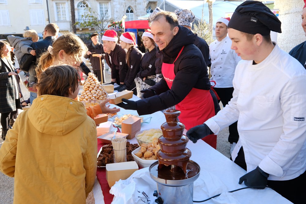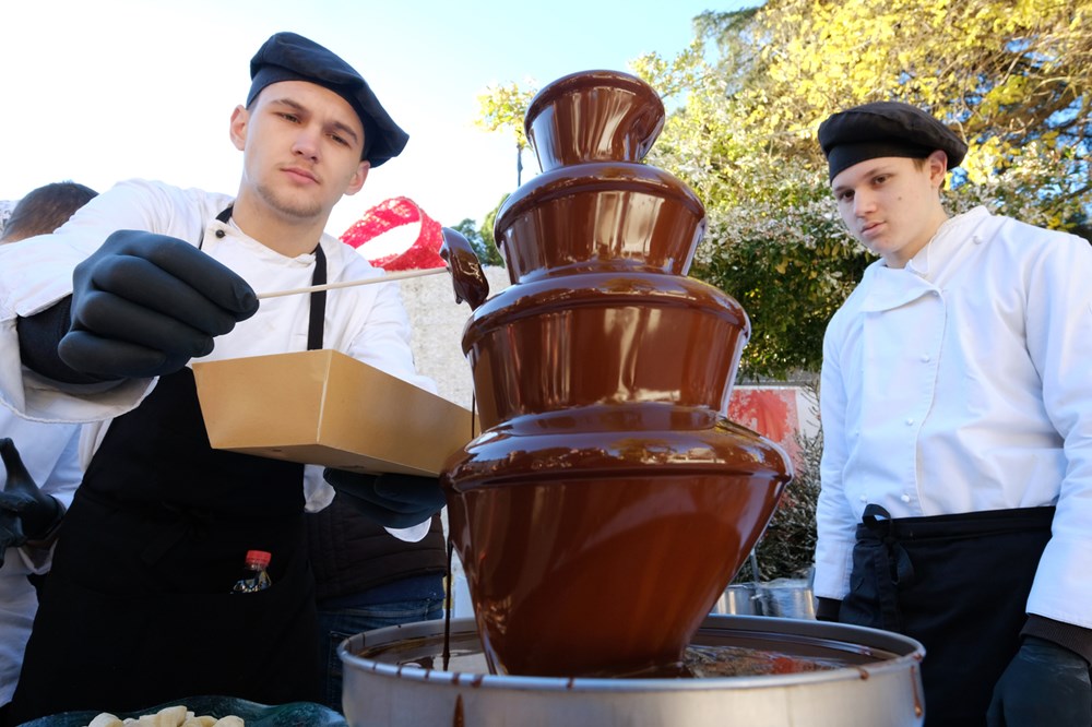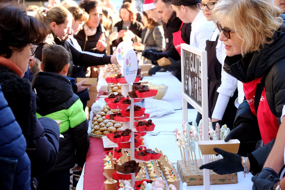 Uz zvuke božićne glazbe, učenici su uz razgovor s posjetiteljima podijelili četiri tisuća fritula napravljenih po domaćem receptu, šarene puslice, francuski Croquembouche (mali profiteroli), sušeno i svježe voće te cornflakes uronjen u čokoladnu fontanu, a bio je tu i poseban kutak s bezglutenskim slasticama. Fontane s kojih se lijevala bijela i tamna čokolada stvarale su zaista primamljiv prizor, a rijetko tko je odolio da fritulom ne zagrabi u čokoladni slap.