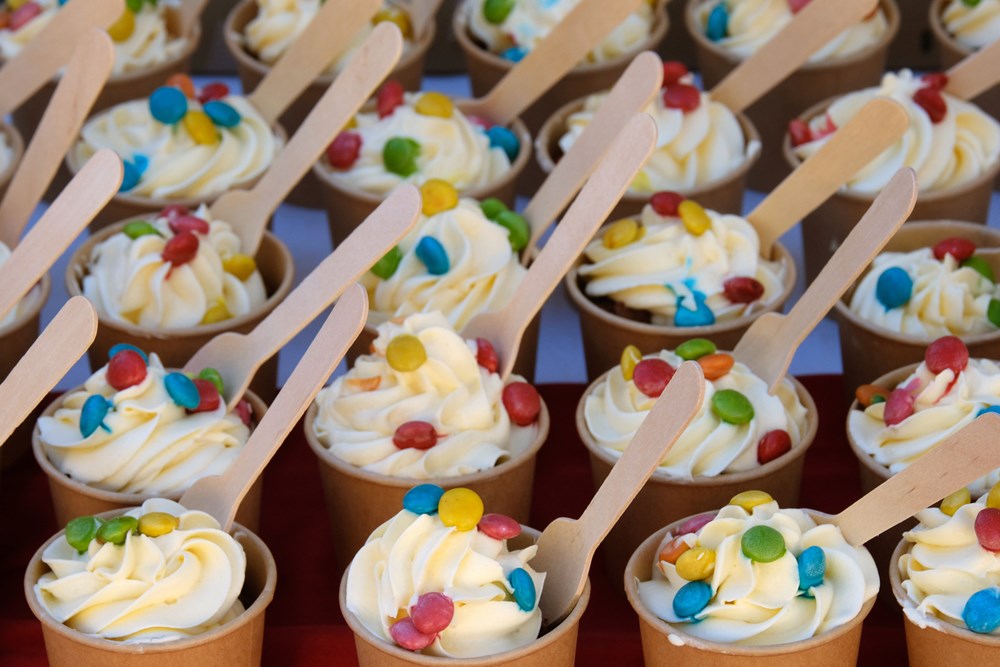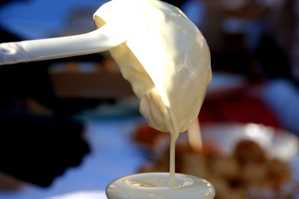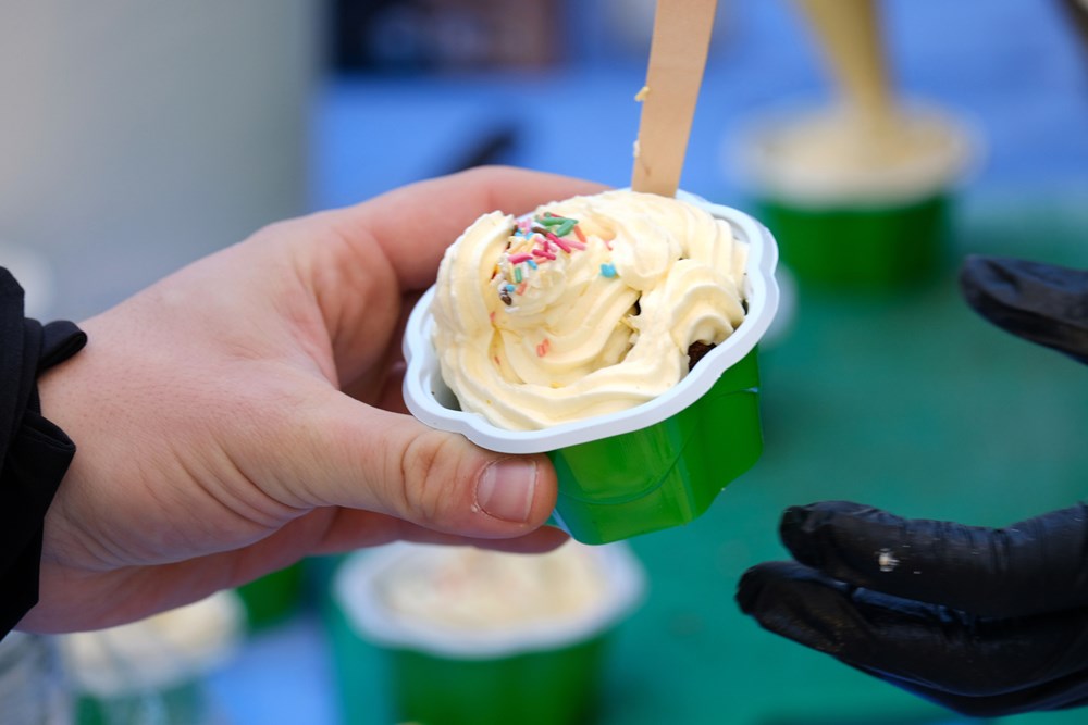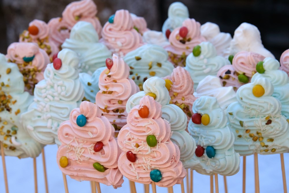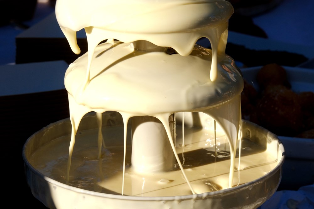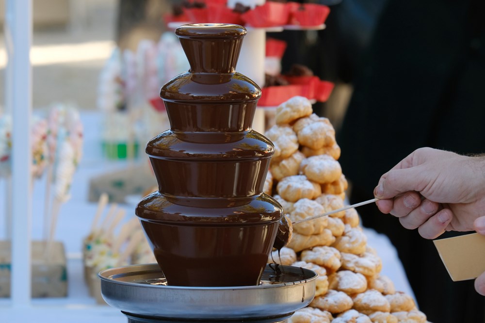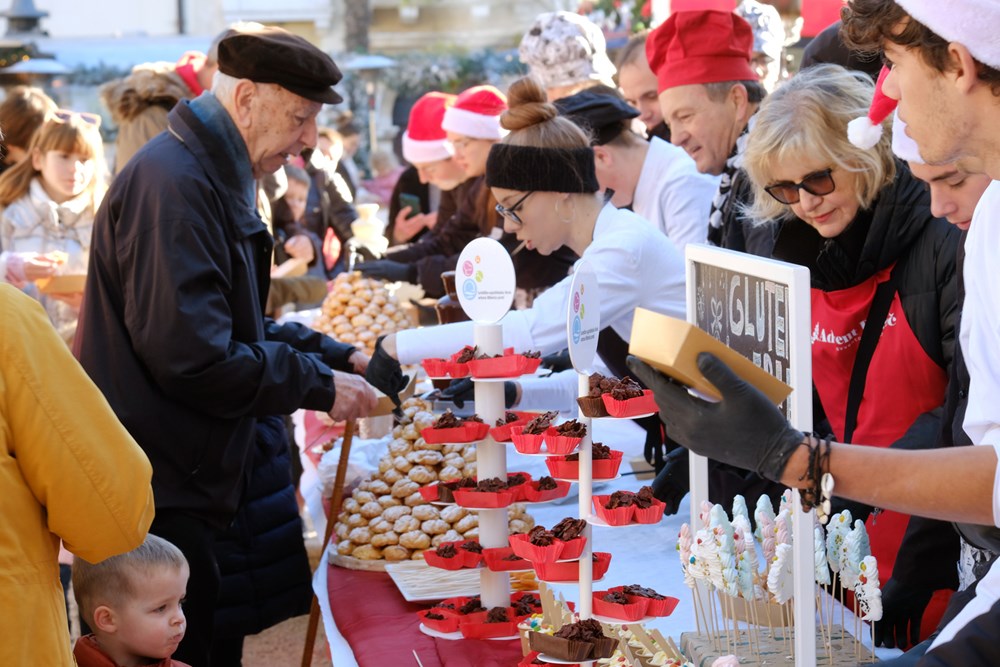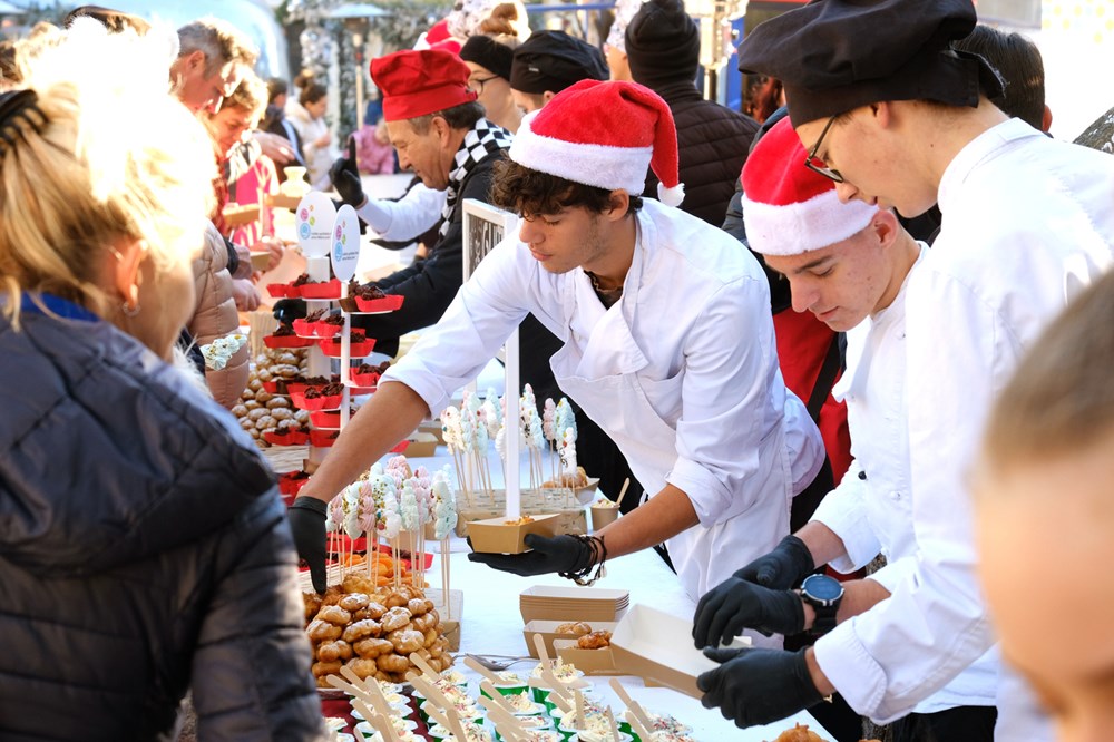 Uz zvuke božićne glazbe, učenici su uz razgovor s posjetiteljima podijelili četiri tisuća fritula napravljenih po domaćem receptu, šarene puslice, francuski Croquembouche (mali profiteroli), sušeno i svježe voće te cornflakes uronjen u čokoladnu fontanu, a bio je tu i poseban kutak s bezglutenskim slasticama. Fontane s kojih se lijevala bijela i tamna čokolada stvarale su zaista primamljiv prizor, a rijetko tko je odolio da fritulom ne zagrabi u čokoladni slap.