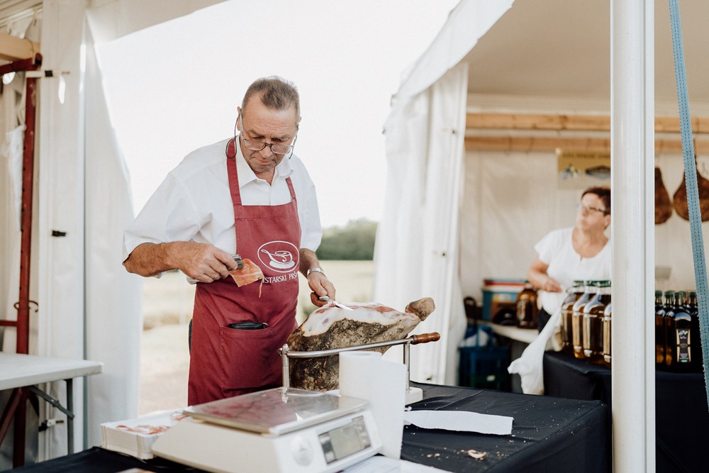 Inače, po tradiciji se pršut reže ručno, posebnim nožem, pa će svaki od pršutara goste osobno ponuditi ovom delicijom, ispričati nešto o njezinom nastanku i objasniti kvalitete pršuta. Istarski pršut je nositelj europske zaštićene oznake izvornosti, a od ostalih se hrvatskih pršuta, a i od onih iz drugih europskih zemalja, razlikuje po tome što se proizvodi bez kože, bez nogice, sa zdjeličnom kosti, bez dimljenja, i suhim salamurenjem.