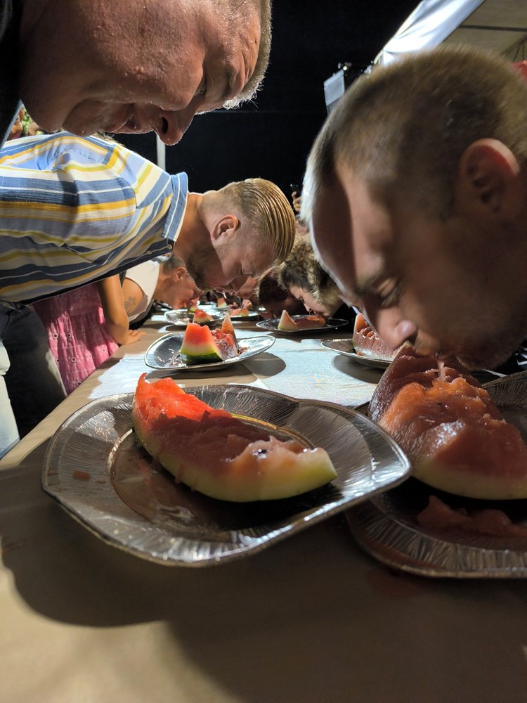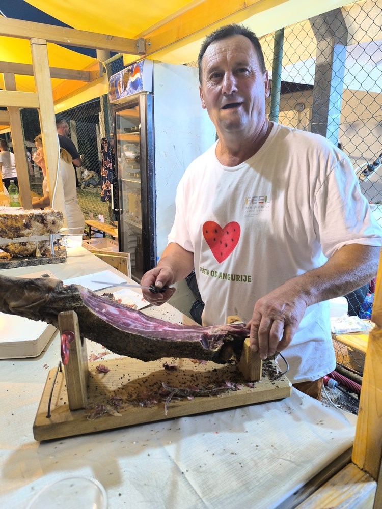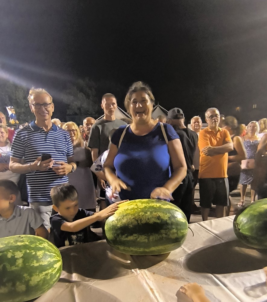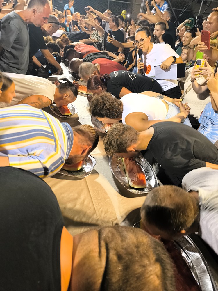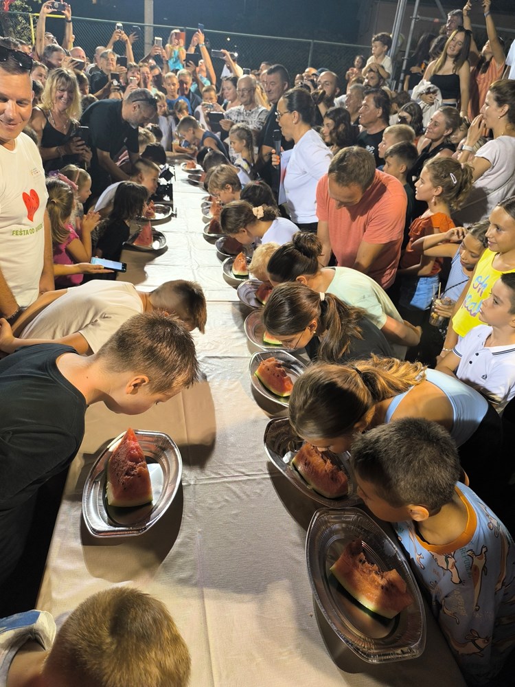 Ogroman red tokom cijele večeri bio je na štandu gdje se posjetiteljima besplatno dijelila narezana angurija, a neopisiva gužva se stvorila i oko stolova gdje se održavalo natjecanje u brzom jedenju lubenice. U dječjoj kategoriji prijavilo se 24 natjecatelja dok je odraslih bilo 21. Pravila su govorila da je pobjednik onaj tko s rukama na leđima prvi pojede crveni dio na kriški lubenice. Kako mali, tako i veliki sudionici ove zabavne igre nastojali su pobijedili pa smo vidjeli spektakularno natjecanje gdje je sve prštalo od koštica i crvenog nektra.