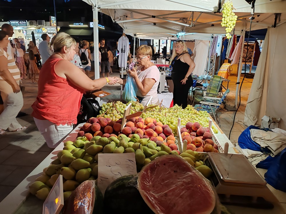 Prodavačica na susjednom štandu iz Rijeke koji je nudio voće nije bila raspoložena za razgovor pravdajući se da je ona samo prodavačica i da bez vlasnika ne može ništa reći. No, zabilježili smo cijene voća koje nam nije izgledalo kao domaće, kilogram grožđa 4,5 eura, kruške i breskve po 3,5 eura, lubenica, lubenica 1,5 euro za kg. Pa tko voli neka izvoli.