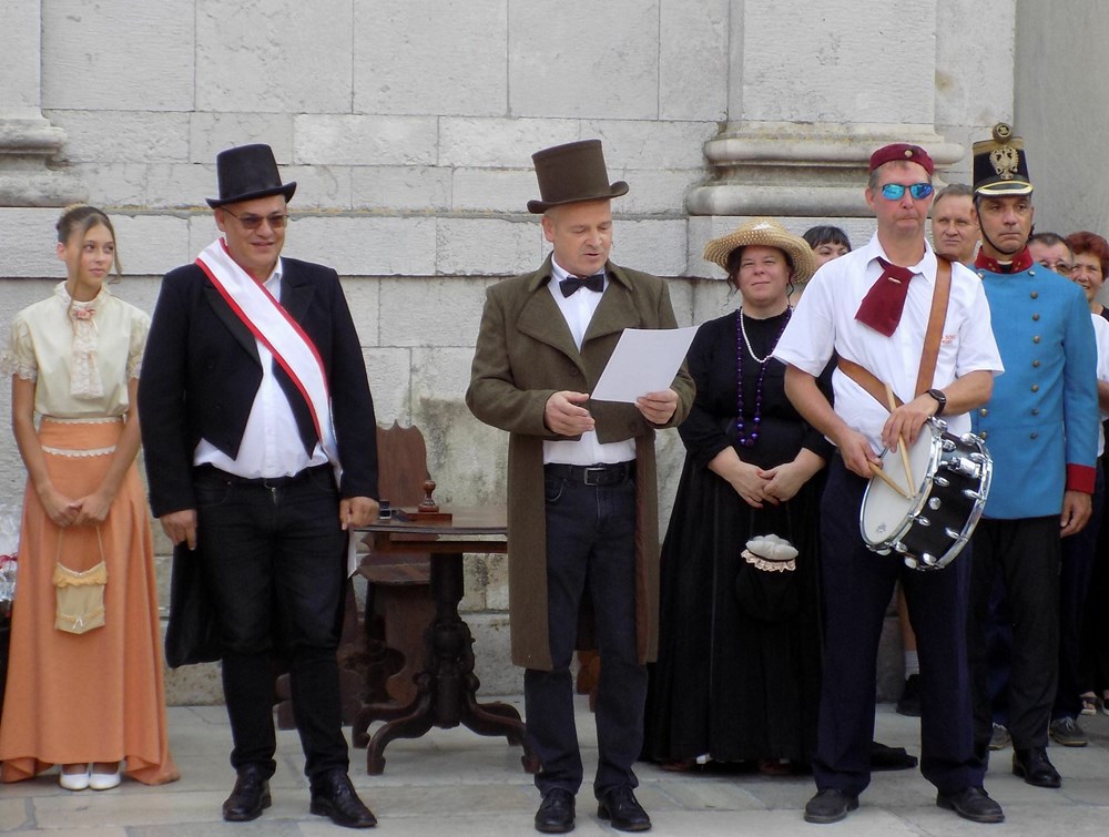 »Z Bojžon milosti, podeštuar ud buzetskiga komuna Damir Kajin Matićev od Milana iz Kajini i Marije Škrbinerke, je deštinau da će se nedeja, na dan svete Marije Male, 8. šetembra, jušto kada zazvoni pudan, u Storen grode Buzete utpret samanj. Na samje iz artikula prviga moraju se prežentat stare užance koko su živeli naši stari pred stu let. Dok je zdinjena bandjera na Velih vratah je anka samanj utprt. Si j’di dubre voje moreju prić uboć to samanj. Kada pasaju skuzin Vela ili Mala vrata naj puzobijo na se brige, na konfužjone i barufe. Jite i pijte kuliko morete, ma senako imejte ena regula.«