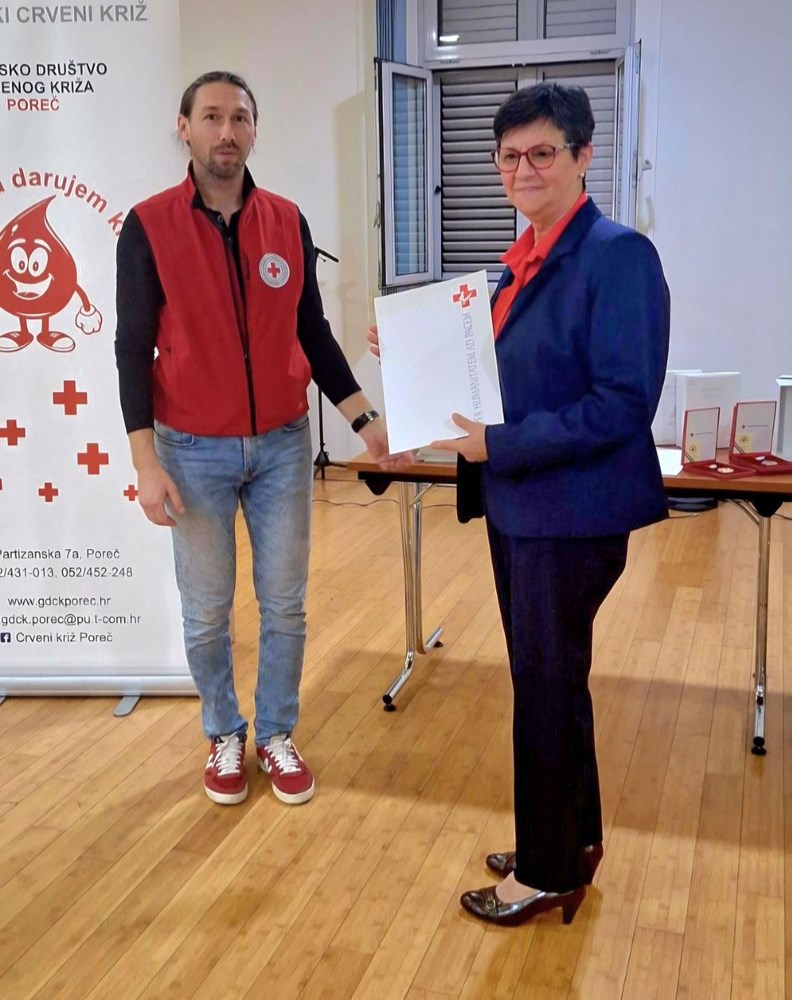 Povodom obilježavanja Dana dobrovoljnih darivatelja krvi, koji se u Hrvatskoj obilježava 25. listopada, jučer je u Obrtničkom domu Poreč održan svečani prijem za jubilarne darivatelje krvi. Prijemu je, uz predstavnike Gradskog društva Crvenoga križa Poreč, prisustvovao i gradonačelnik Grada Poreča, Loris Peršurić, koji je ovom prigodom istaknuo kako je darivanje krvi jedna od najhumanijih gesta koju čovjek može napraviti. "Davanje dijela sebe, tvari koju je nemoguće proizvesti i koja je nezamjenjiva, izraz je nesebične brige za druge", rekao je gradonačelnik, zahvalivši darivateljima u ime svih građana Poreča i uručivši zahvalnice jubilarnim darivateljima.