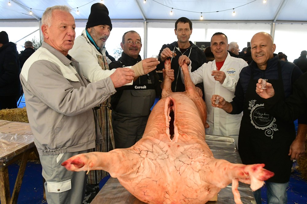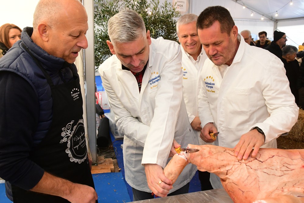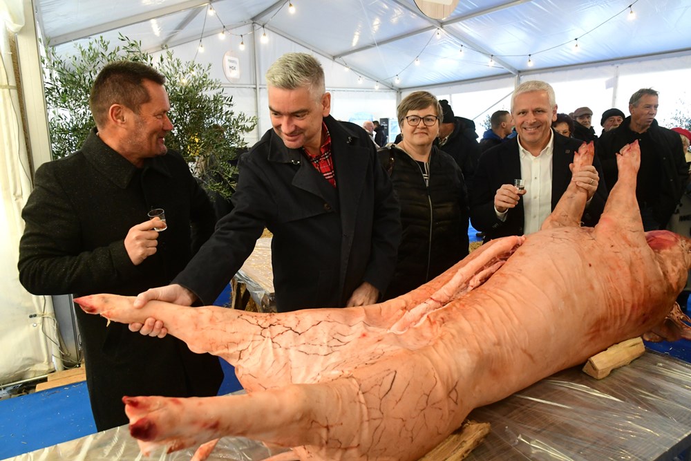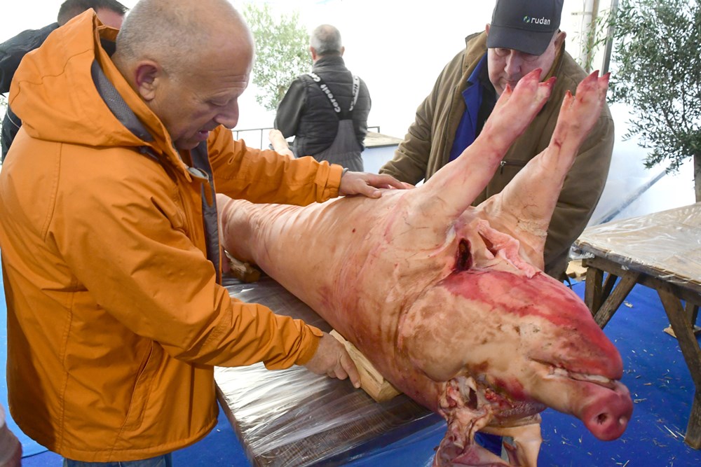 Svjetski dan istarske kobasice, prvim rezom svinje teške 155 kilograma, simbolično su otvorili istarski župan Boris Miletić i supetarski načelnik Mario Bratulić, uz asistenciju županijskog pročelnika za poljoprivredu Ezia Pinzana.