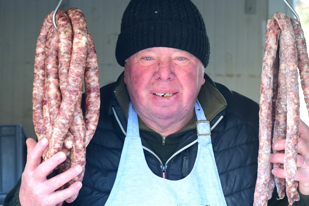 Malo dalje dočekao nas je rumeni Erman Danijel iz istoimenog OPG-a, kojem na zbijenom kiosku vise svakakvi svinjski proizvodi. I on i proizvodi su, kaže, iz Žminja.