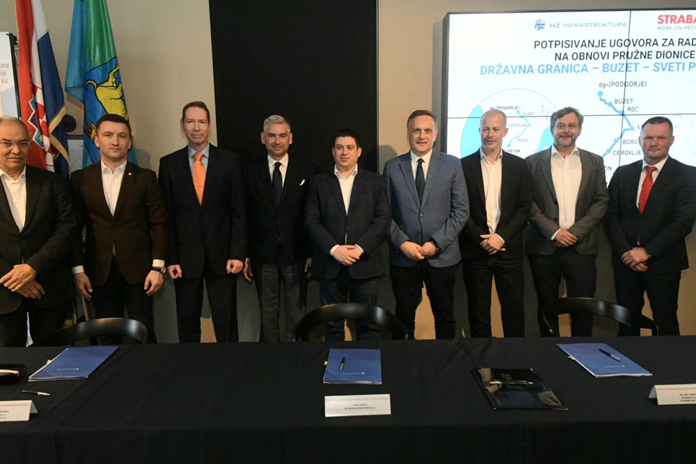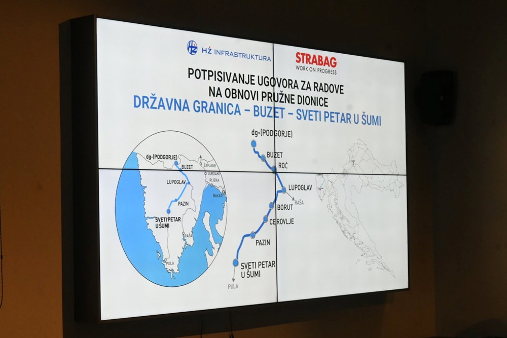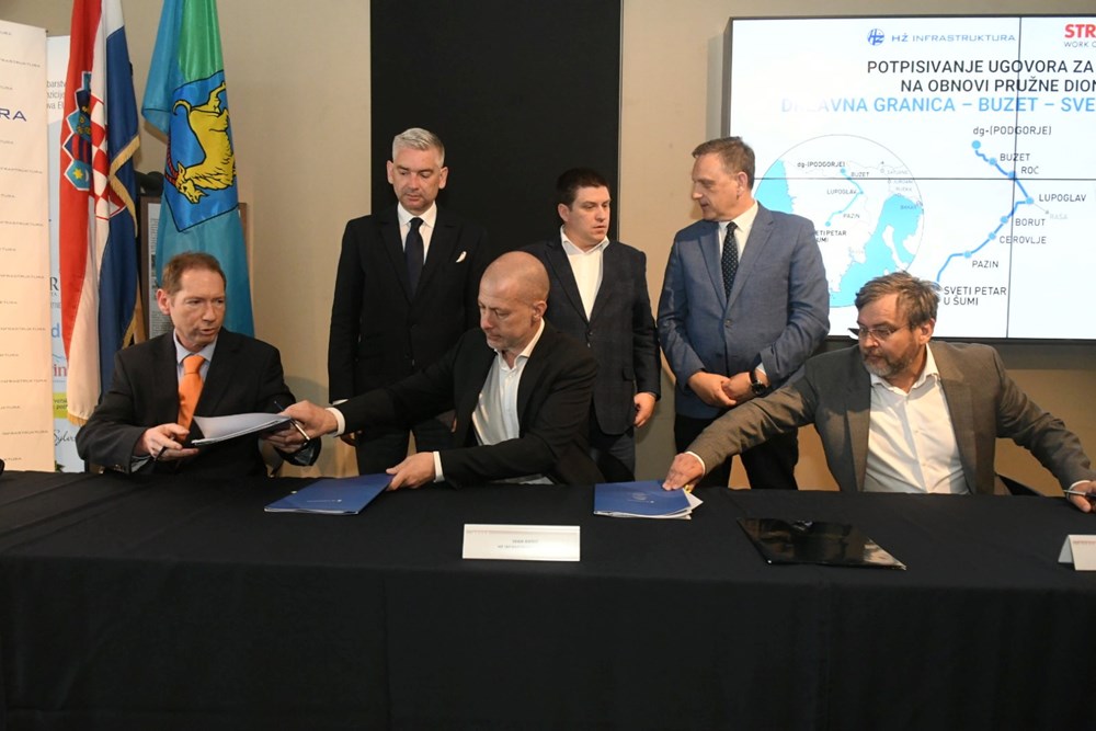 Ugovor za radove na obnovi dionice pruge državna granica - Buzet - Sveti Petar u Šumi potpisali su danas u Svetom Petru u Šumi predsjednik Uprave HŽ Infrastrukture Ivan Kršić s odabranim izvođačem radova, tvrtkom Strabag, u nazočnosti potpredsjednika Vlade i ministra mora, prometa i infrastrukture Olega Butkovića.