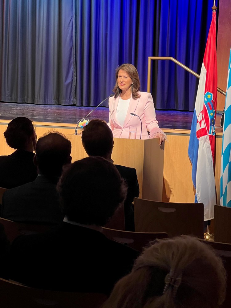 U tom razvoju, Njemačka – a posebno Bavarska – ima iznimno važnu ulogu. Ne samo zato što s Njemačkom imamo snažne gospodarske veze, nego imamo i partnerske gradove, brojne turiste, ali prije svega – iskrene prijatelje. Zato smo ovdje ne samo da proslavimo Dan državnosti, već i da potvrdimo to prijateljstvo. Prijateljstvo koje traje, raste i koje se temelji na uzajamnom poštovanju i suradnji. Ponosni smo na našu suradnju, ponosni smo na sve vas koji nosite Hrvatsku u srcu, i koji ste most između dvije
