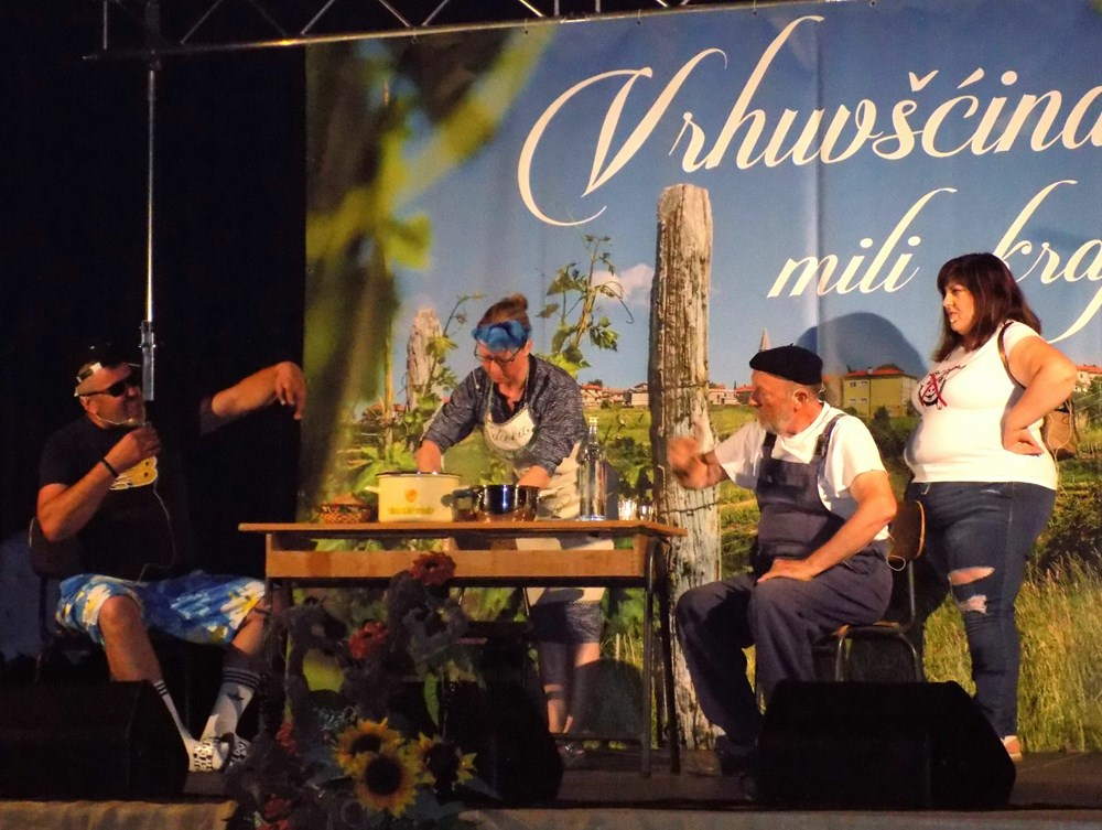 Pučki teatar Vrh: Valentina Buršić, Zdenka Majcan, Vlado Paladin i Branko Majcan, izvrsno uigrana glumačka ekipa s Vrhuvštine čiju točku svi nestrpljivo čekaju, za ovu je prigodu pripremila igrokaz: Štorija ud šteri praščića. Pozornicu su potom zauzeli Barušani: Rafael Černeka, Manuel Marušić i Matej Paladin, susjedi harmonikaši iz Gregorići i Barušići, okupljeni u harmonikaški sastav. Potom i mladi mužikanti Vrhuvšćine: Matija, Valentino i Damjan Šćulac i Luka Rašpolić koji dolaze iz Šćulci i Paladini.